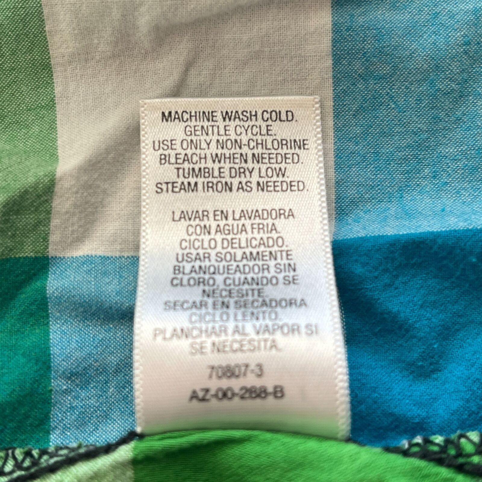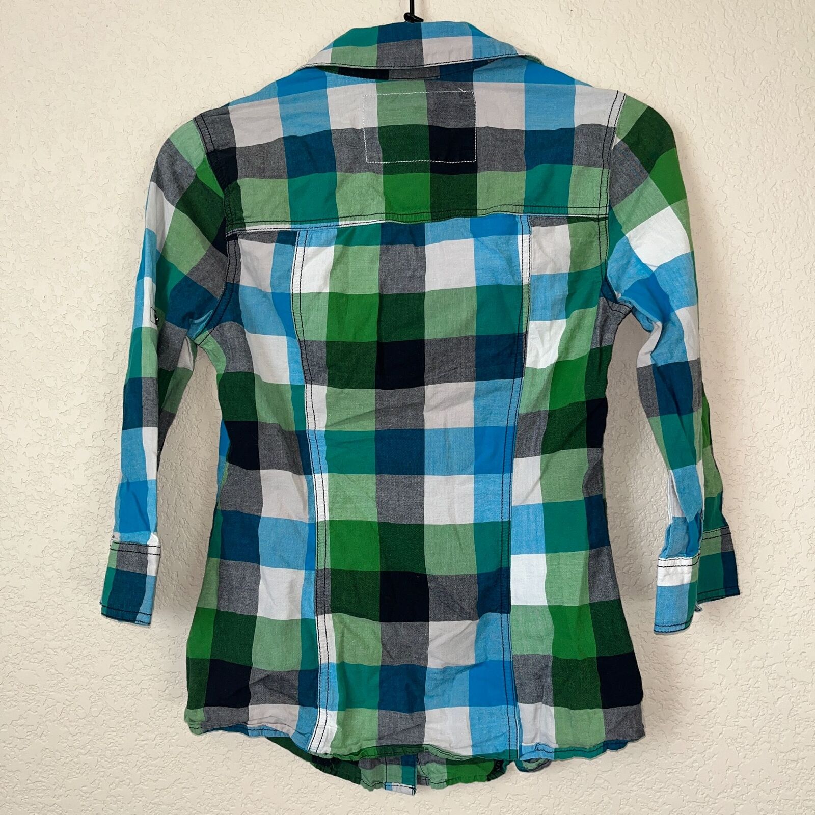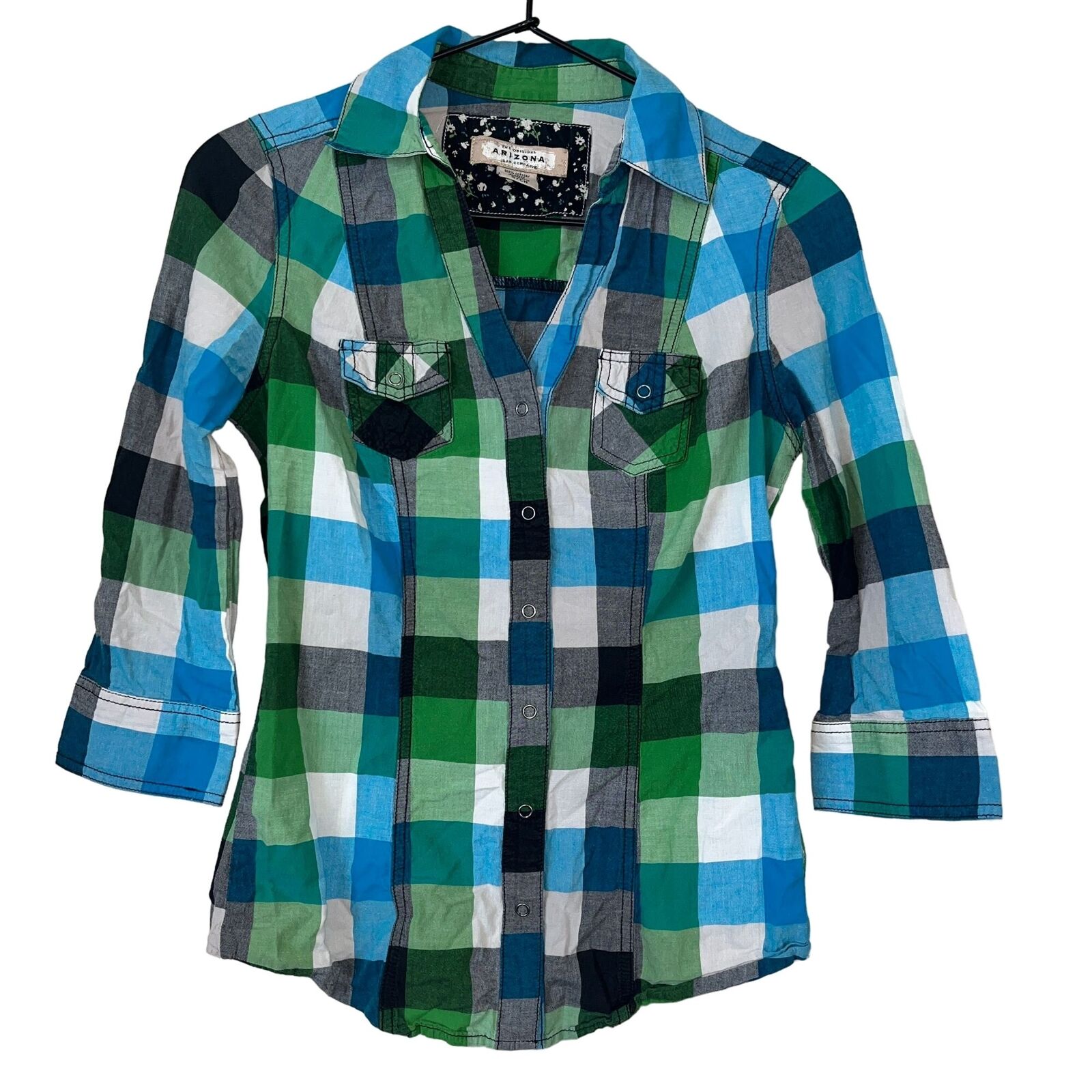 Arizona Jeans Womens Sz S 100% Cotton Button Down Plaid Shirt Blue Green