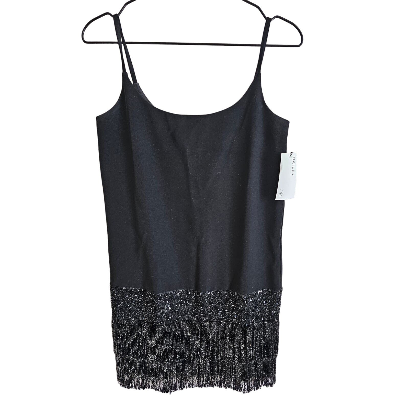 This stunning black beaded mini dress from Bailey 44 is perfect for any formal occasion. The intricate beading and flapper style design make for a unique and elegant look that is sure to turn heads. The dress is a size XS and would be ideal for someone looking to add a touch of vintage glamour to their wardrobe.