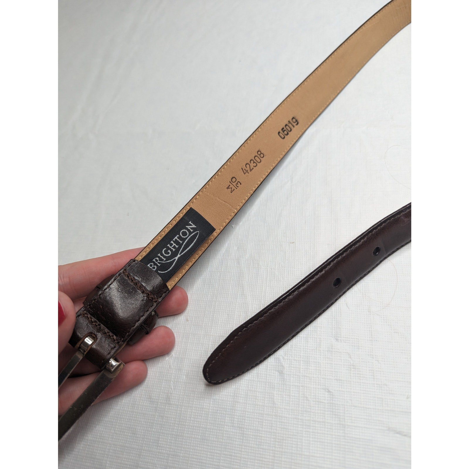 Add a touch of classic style to your wardrobe with this Brighton women's dark brown leather belt in size M (30). Expertly crafted from high-quality leather, this belt is a must-have accessory that will complement any outfit. The timeless design features a simple buckle closure and is perfect for both casual and formal occasions. Crafted with attention to detail, this Brighton women's belt is a versatile addition to your wardrobe that will add a touch of elegance to your outfits. The rich, dark brown color is perfect for pairing with a variety of colors and styles, while the sturdy construction ensures that this belt will last for years to come.