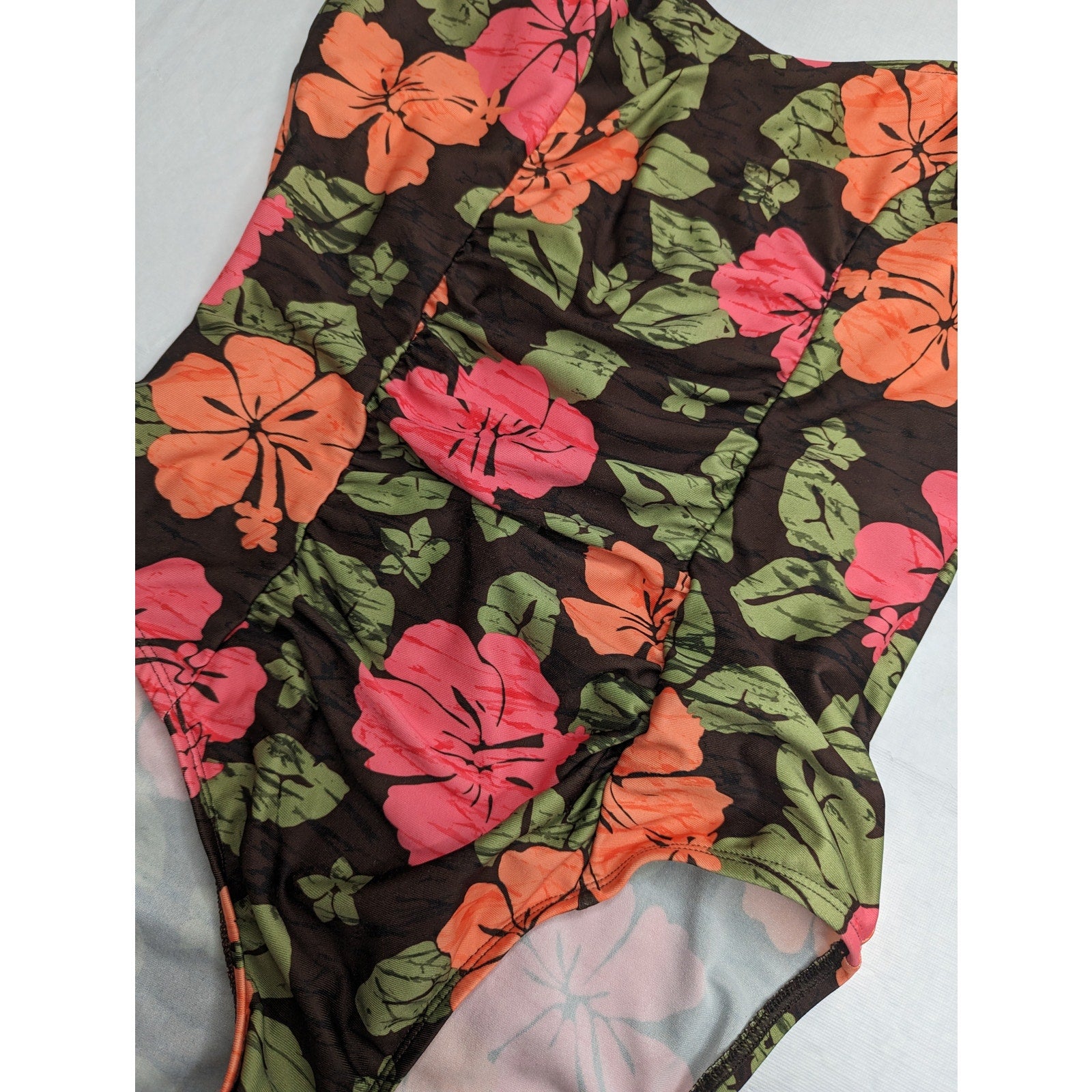 This one-piece swimsuit in size L is perfect for any woman who wants to look stylish on the beach. The unique pink, green, and brown floral pattern will surely catch some compliments. The halter neckline gives it a chic touch while providing enough support for a comfortable fit. It is made of high-quality materials that ensure durability and a long lifespan. The swimsuit has been well-maintained and cleaned, so it is in excellent shape. Take this opportunity to add a fashionable piece to your summer wardrobe, and enjoy your time in the sun with confidence!