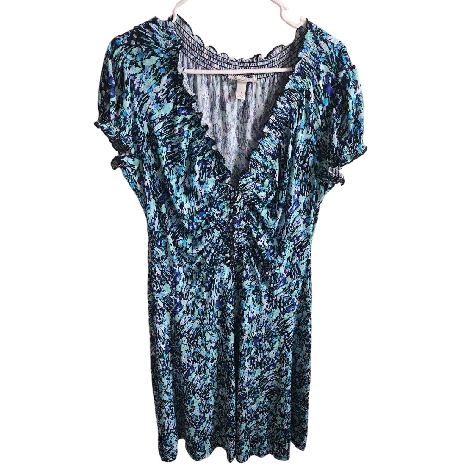 Dressbarn Womens Sz 14 Midi Length Short Sleeve Dress V Neck Blue Abstract Print