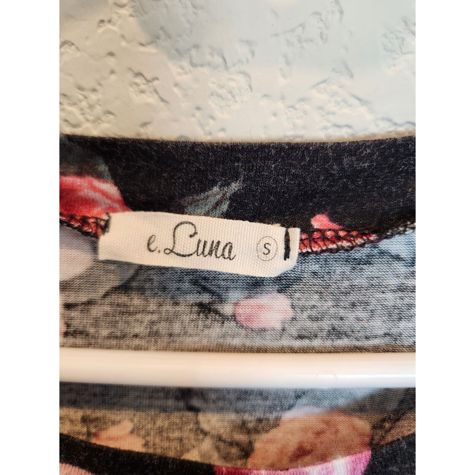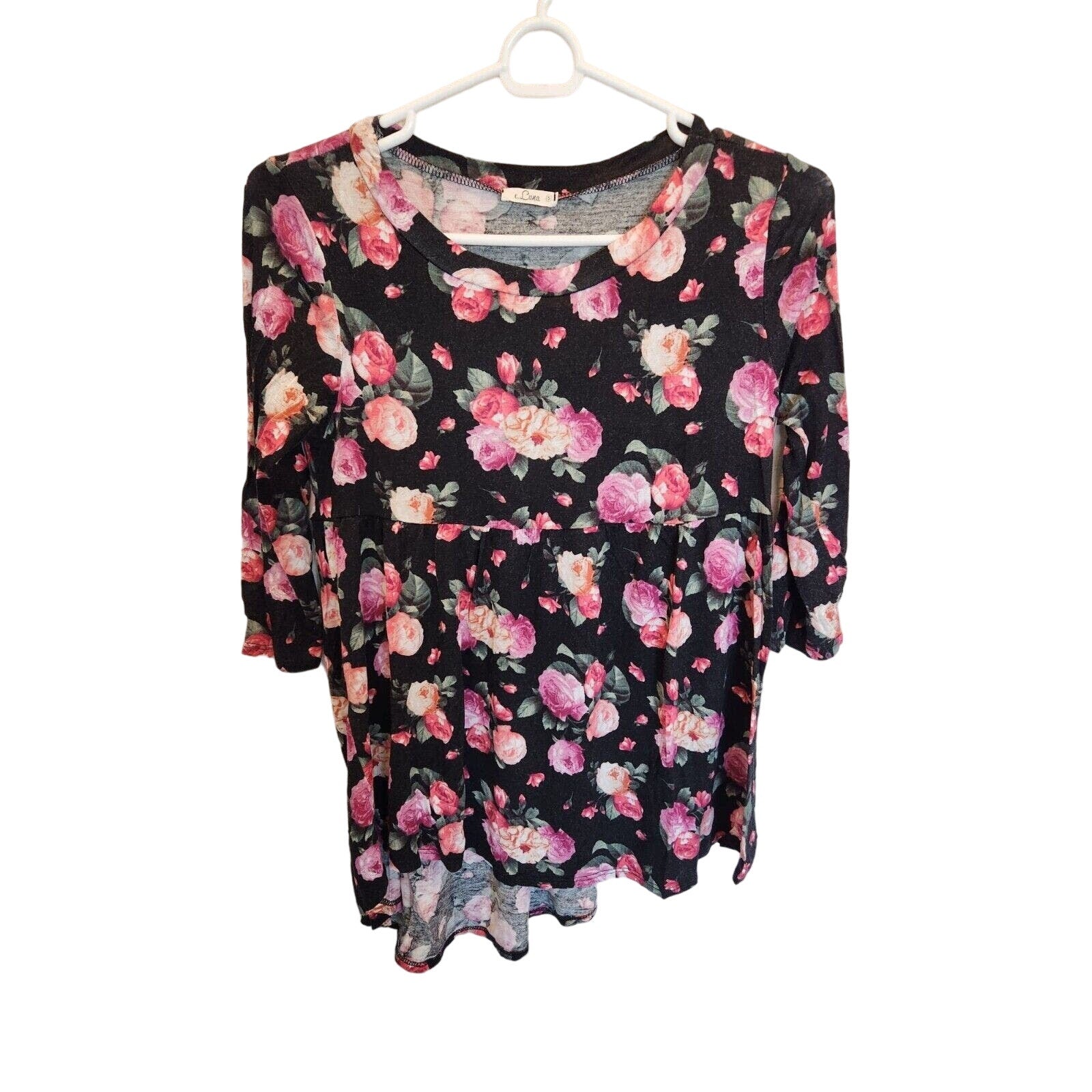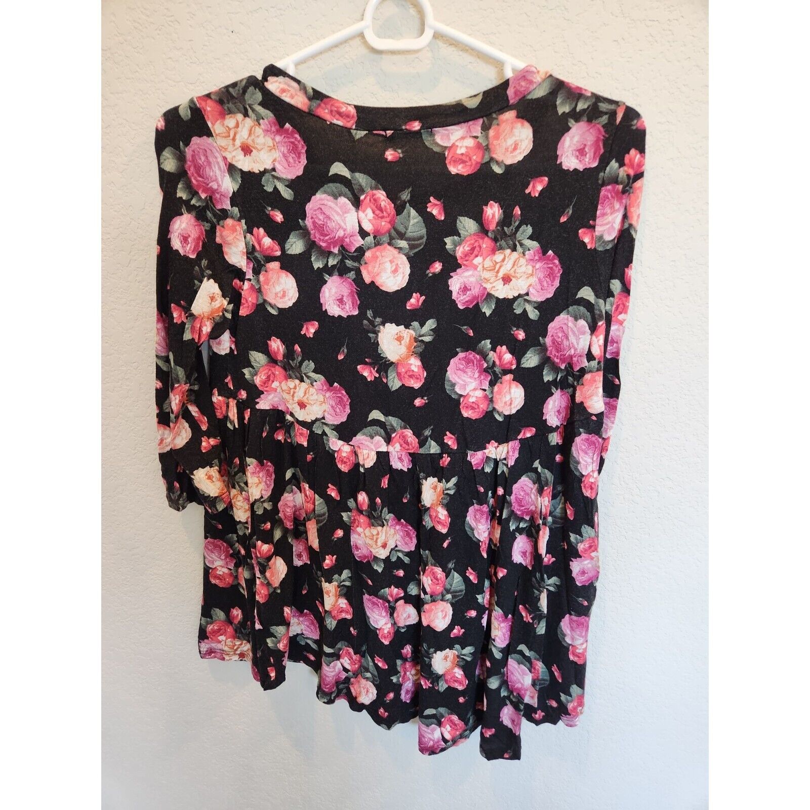 E Lina Womens Sz S 3/4 Sleeve Peplum Blouse Black Pink Floral