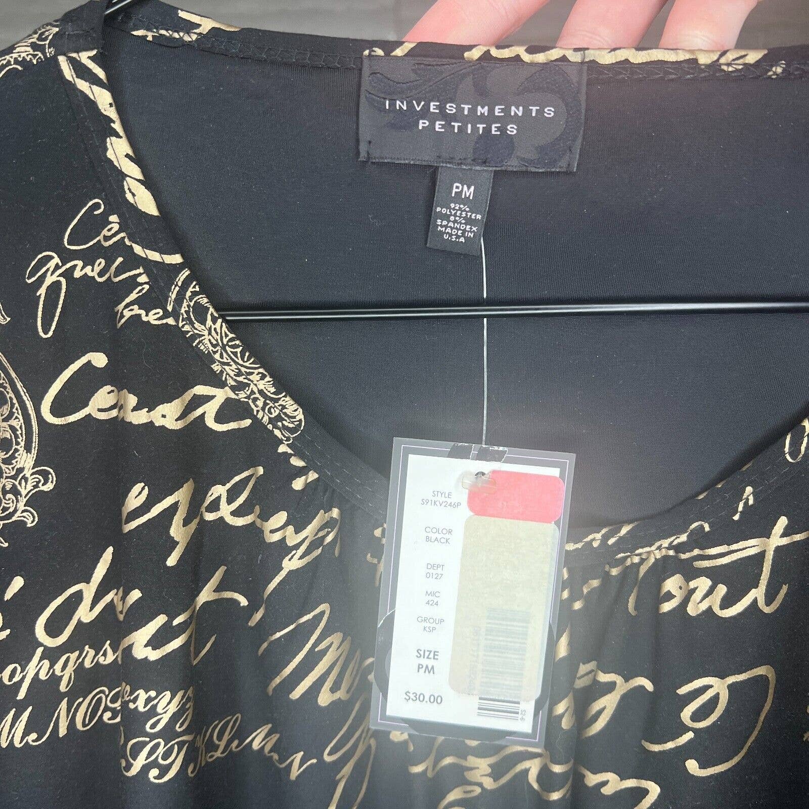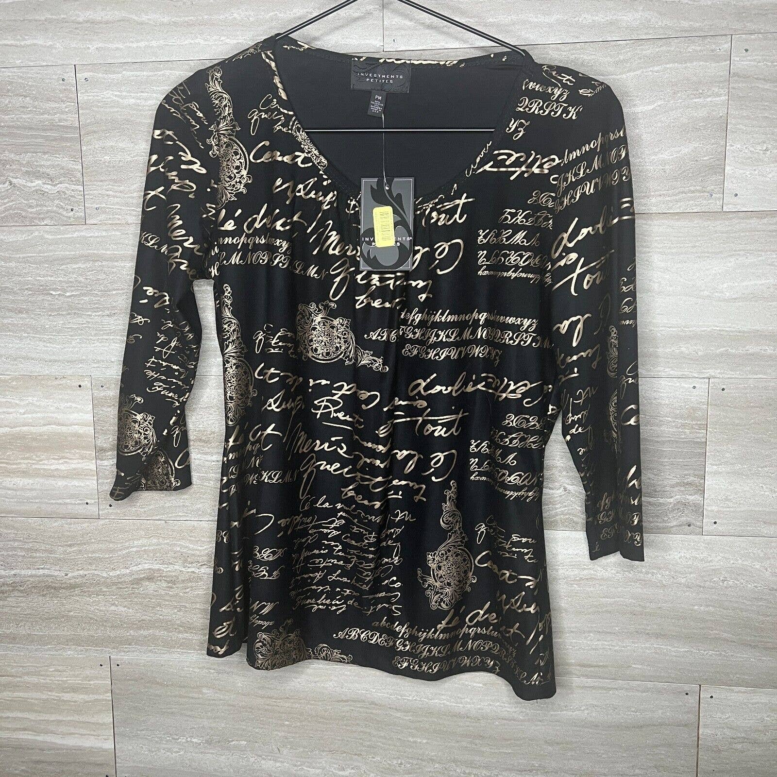 Investments Petites PM Womens Black and Gold Cotton V Neck Shirt Blouse NEW