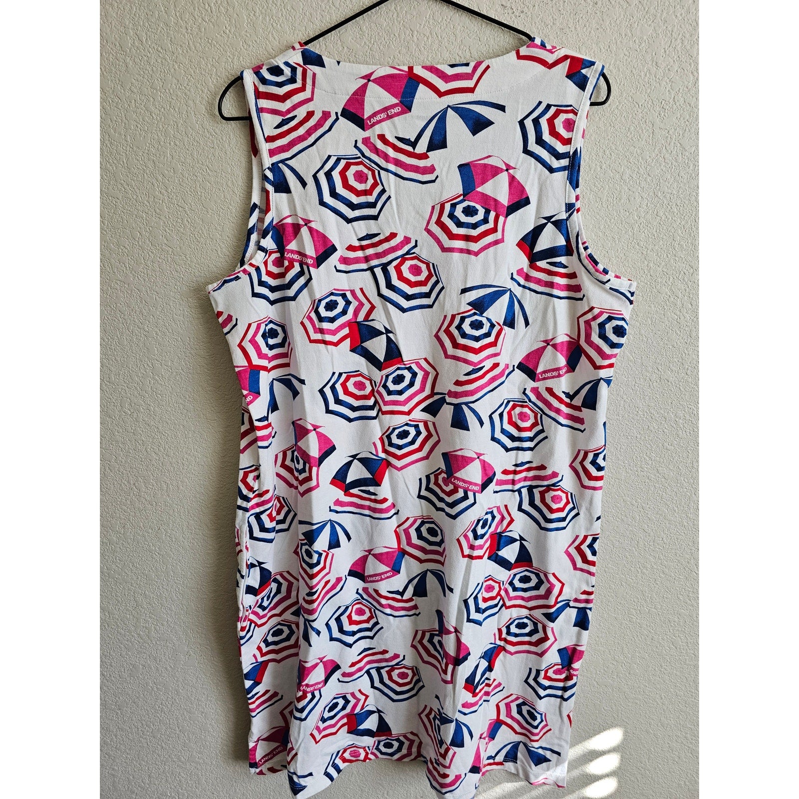 Get ready for summer with this stylish knee-length sleeveless dress from Lands End. Made of 100% cotton, this dress features a fun and playful umbrella print that will make you stand out from the crowd. With a comfortable and flattering fit, this dress is perfect for any occasion, from a day out with friends to a special evening event. The dress is available in size L and is machine washable for easy care. Add this dress to your wardrobe today and step out in style!