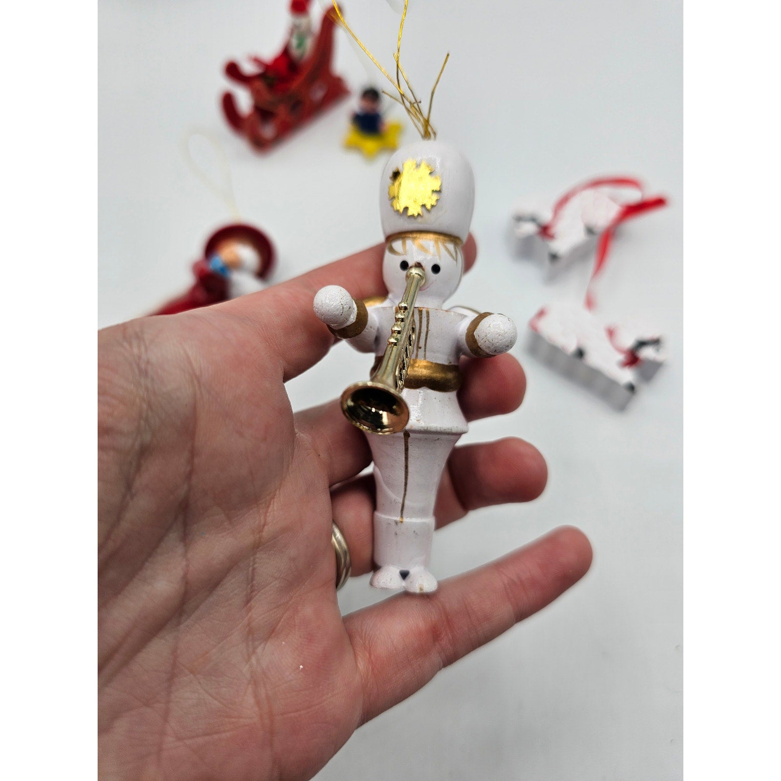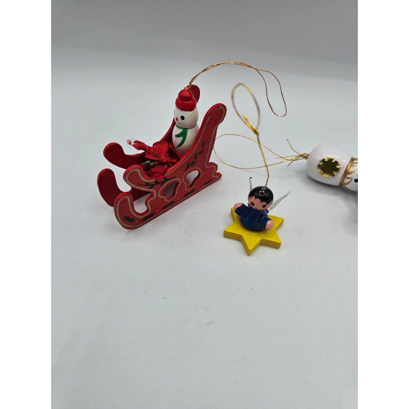 Lot of 5 Vintage Hand Painted Wooden Christas Ornaments Sleigh lamb Soldier