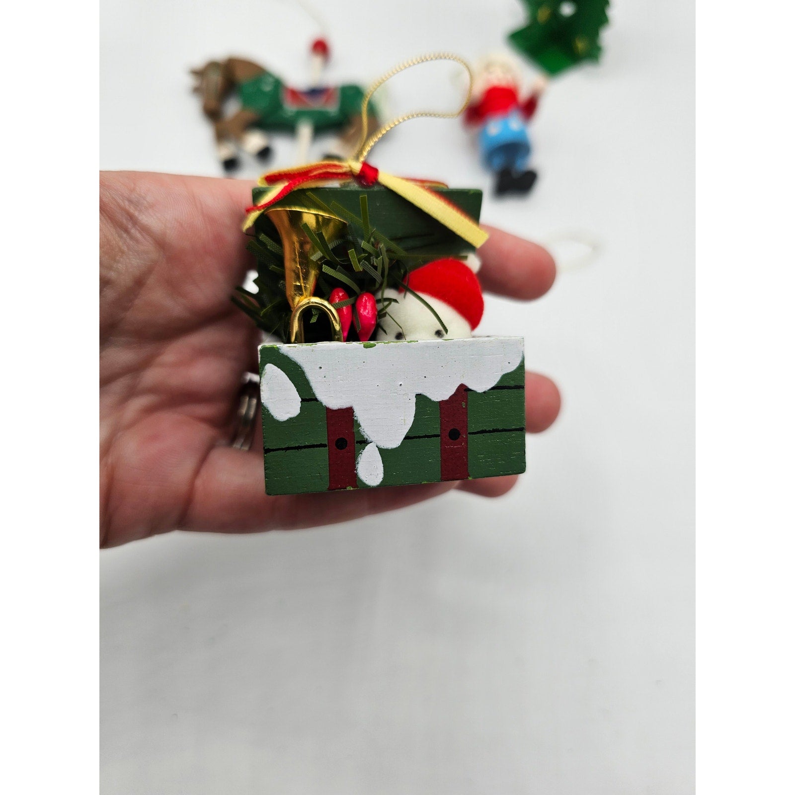 Lot of 5 Vintage Hand Painted Wooden Christas Ornaments Tree Carousel Present