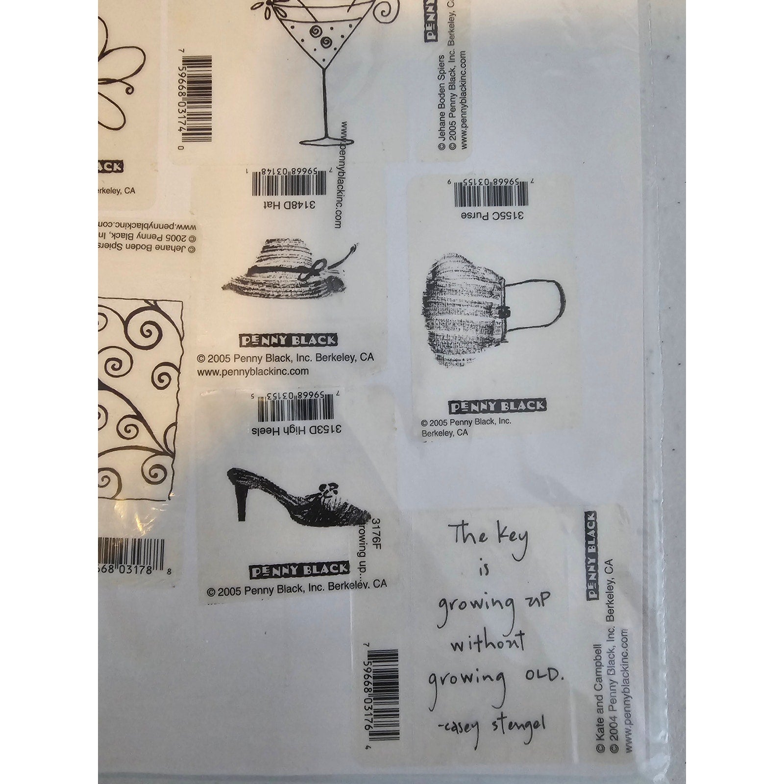 This lot features a collection of unmounted rubber stamps, including designs of the iconic Penny Black, fashionable shoes, a purse, and a Martini glass. These stamps are perfect for any crafting or scrapbooking project, and will add a unique touch to any creation. Each stamp is made with high-quality materials and is ready to use with your preferred ink. Expand your stamp collection with this diverse lot of designs. Order now and add a touch of elegance and creativity to your next project!