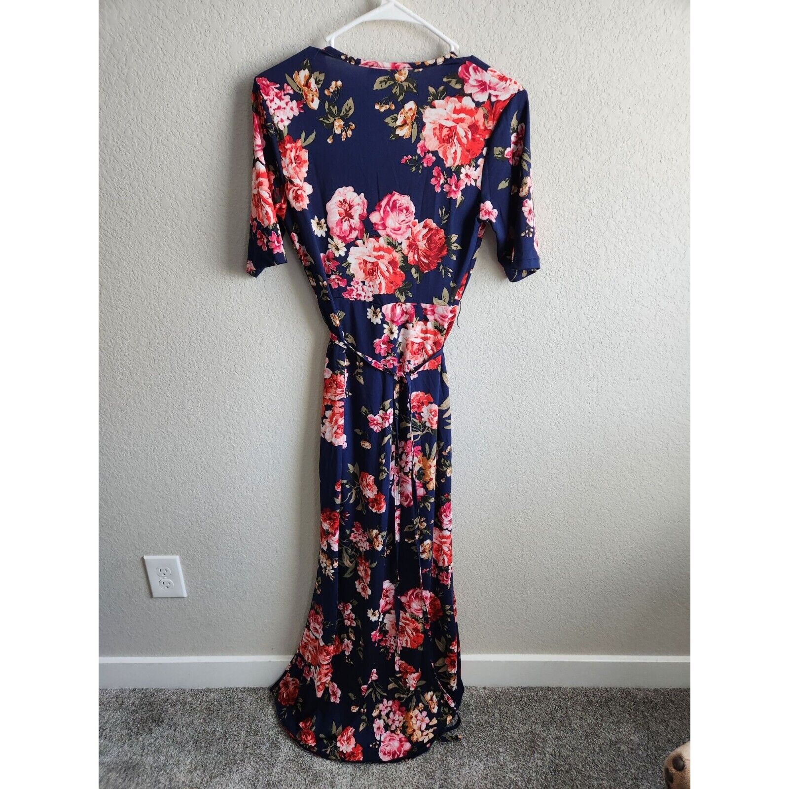 Make a statement with this stunning short sleeve maxi dress with a bold pink floral print and a sexy slit. Perfect for any occasion, this dress will make heads turn. The dress is designed with a flattering fit for women's size L and has stylish stilettos to complete the look. Get this beautiful dress today!