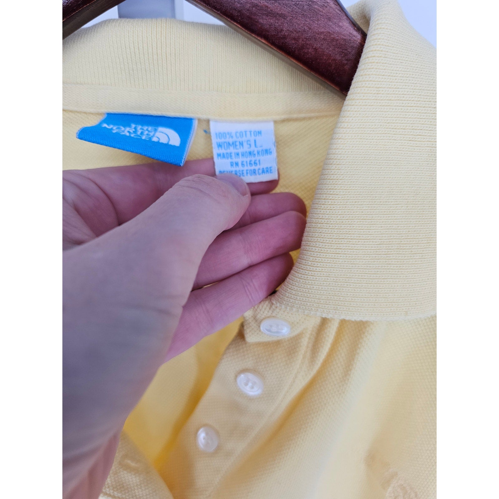 This short sleeve polo shirt is a must-have for any fashion-forward woman's wardrobe. The soft cotton fabric and light yellow color make it perfect for any casual occasion. The shirt features a logo on the front, adding a touch of sporty style. It comes in a women's size L and is made by the popular brand, The North Face. Ideal for any outdoor activity or simply running errands, this polo shirt is both stylish and comfortable. It's perfect for pairing with jeans or shorts and can be dressed up or down depending on the occasion. The shirt is in excellent condition and ready to be worn.