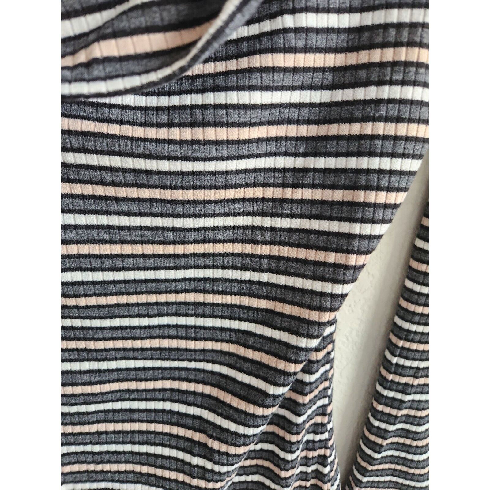 This dress is a versatile addition to any wardrobe. The cowl neck and gray stripes add a touch of sophistication, while the ribbed texture gives it a cozy feel. It's a size medium and would be perfect for any casual occasion.