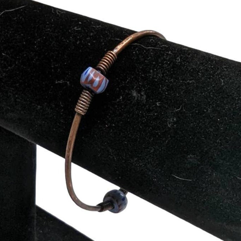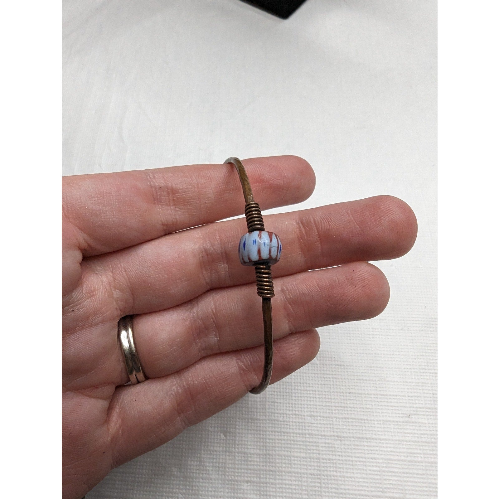 Vintage 1960s Brass Bangle Bracelet W Blue Beads Dainty Small
