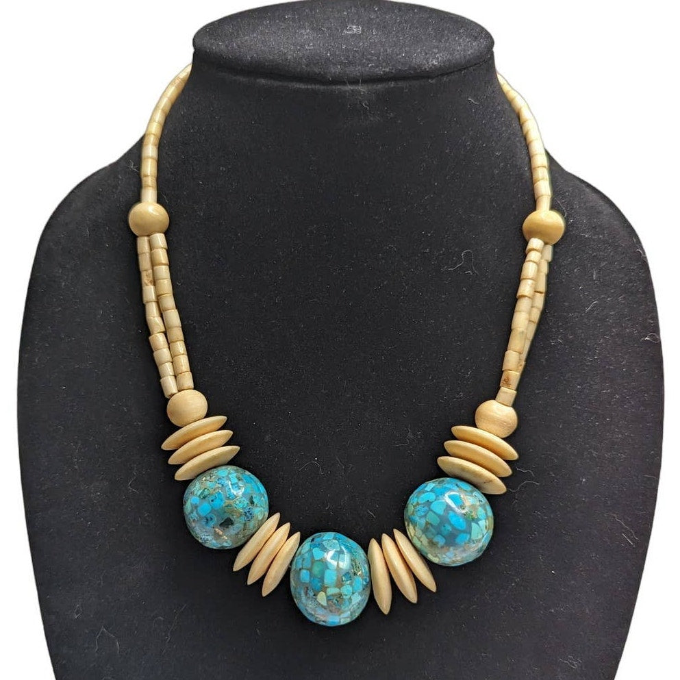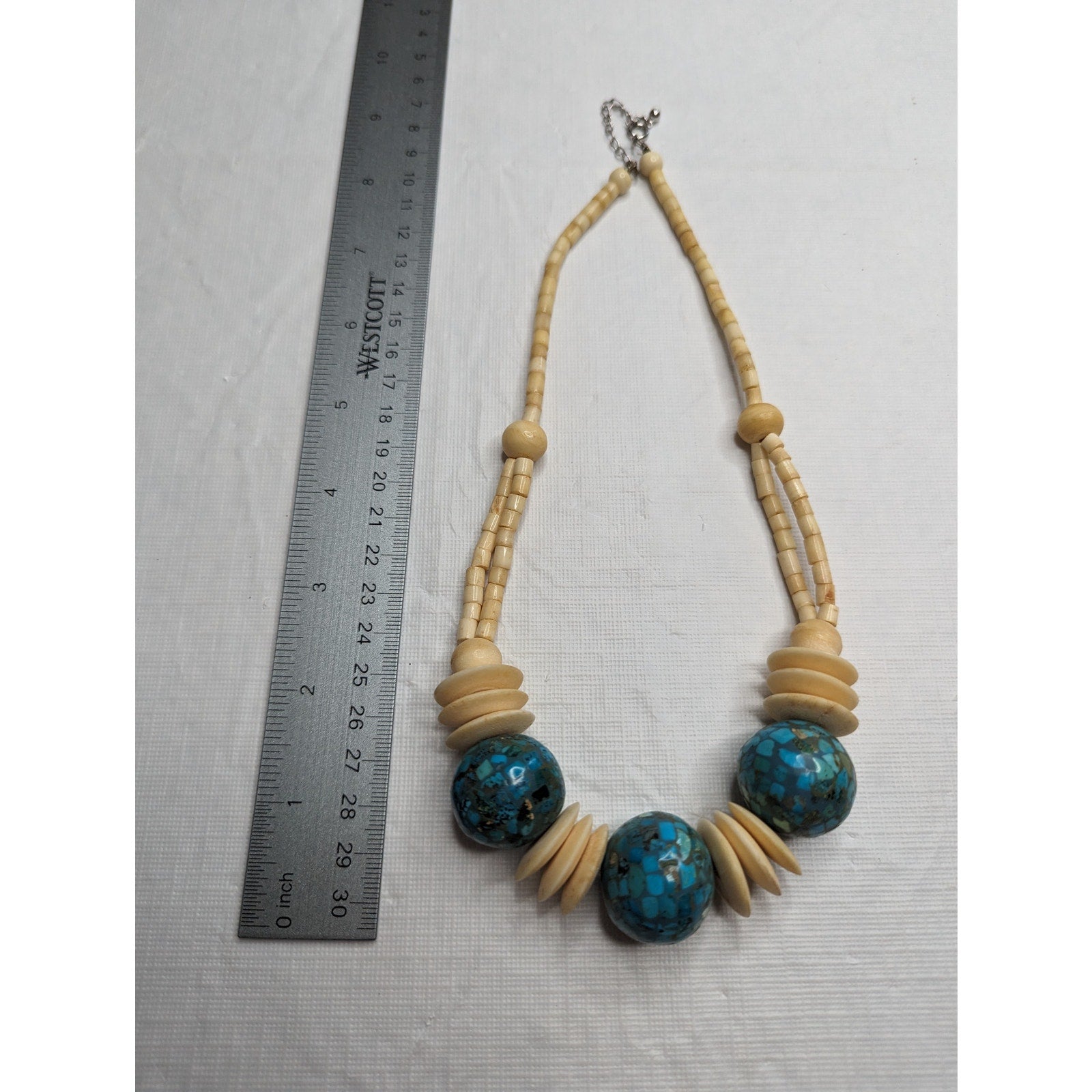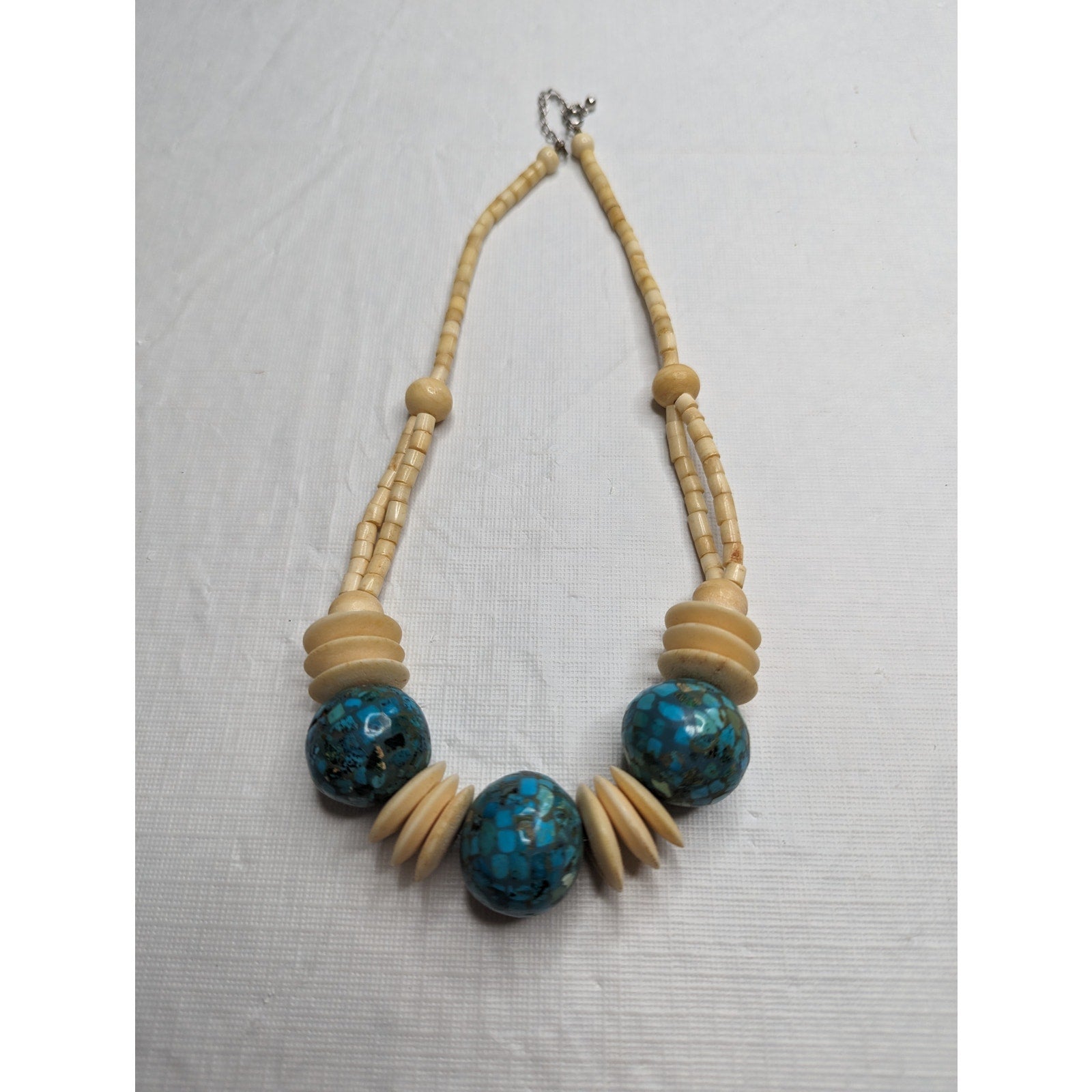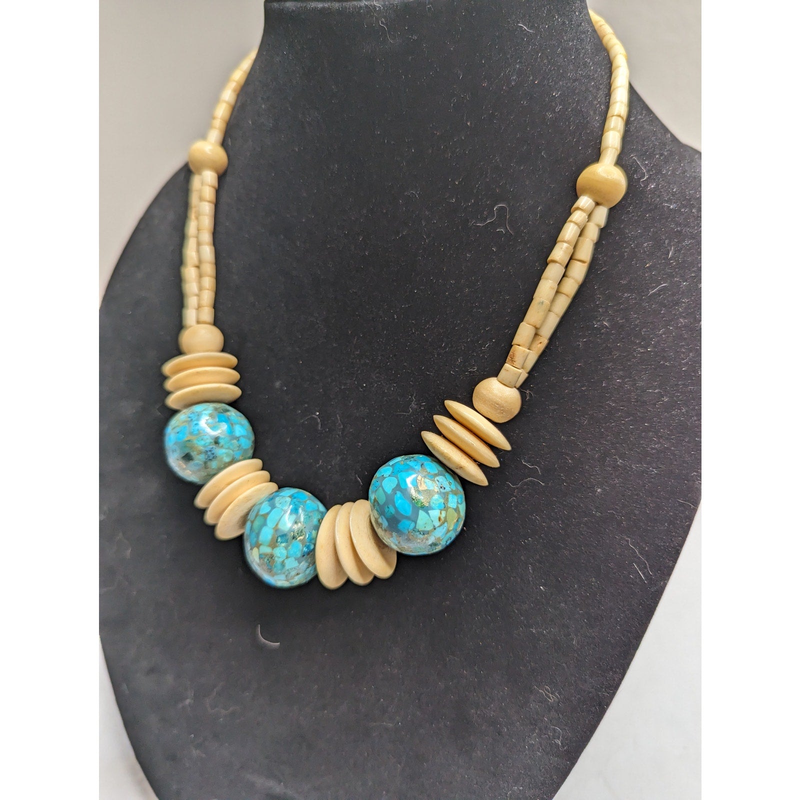 Vintage 1960s Chunky Beaded necklace Cream Tone and Blue Beads