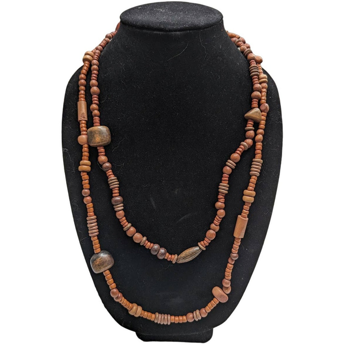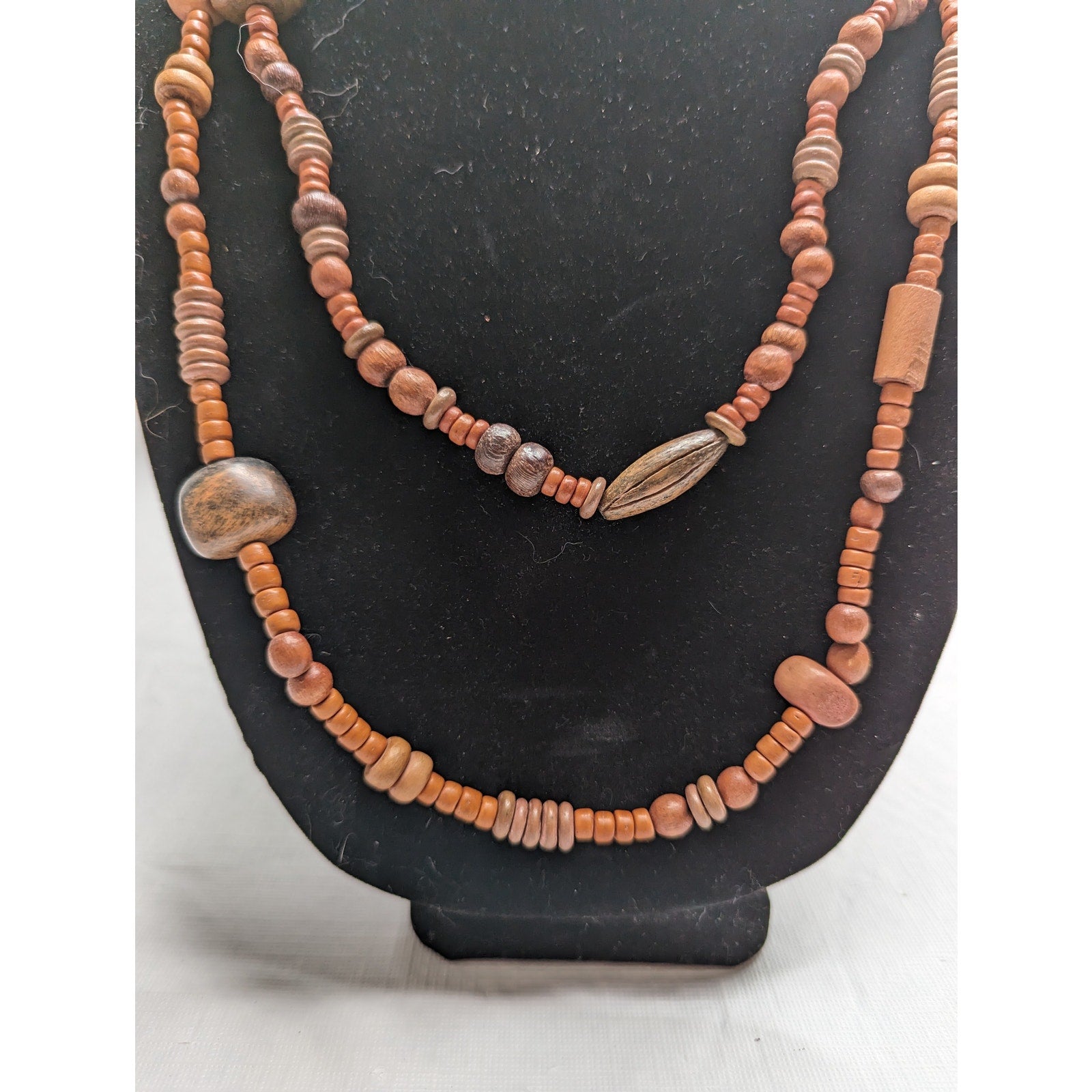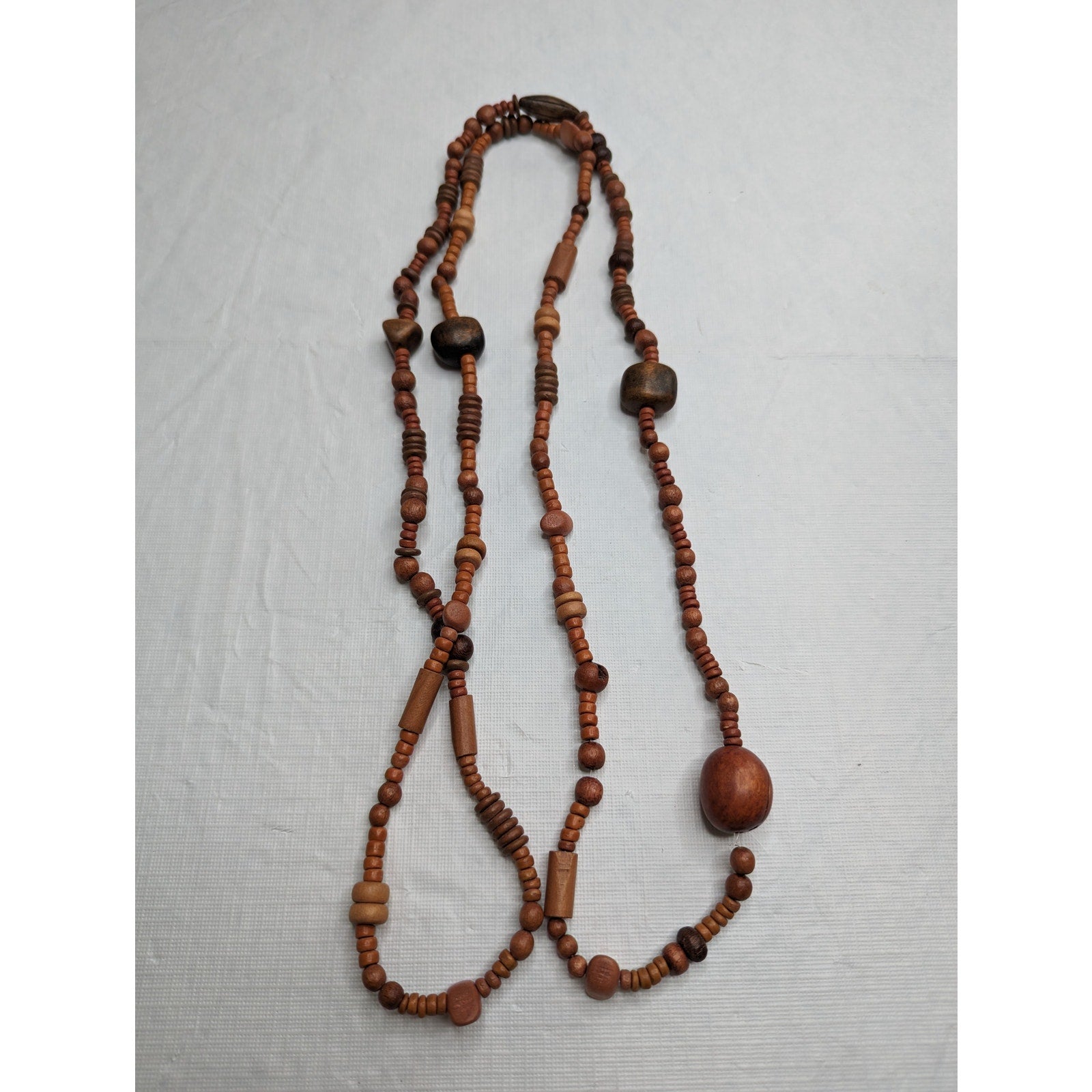 Enhance your jewelry collection with this unique vintage necklace from the 1970s. The single strand wooden beads come in various sizes, giving the necklace a chunky and stylish look. This timeless piece is perfect for any occasion, whether you're dressing up or keeping it casual. The necklace is long, making it easy to layer with other jewelry pieces. Its rustic charm and vintage appeal will make it a favorite in your accessory collection.