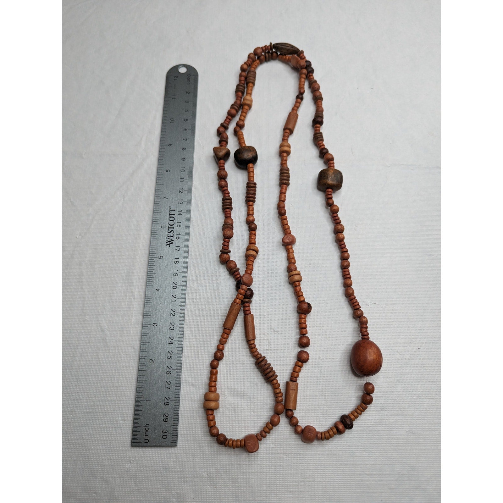 Vintage 1970s Long Single Strand Wooden Beaded Necklace Chunky Various Sized