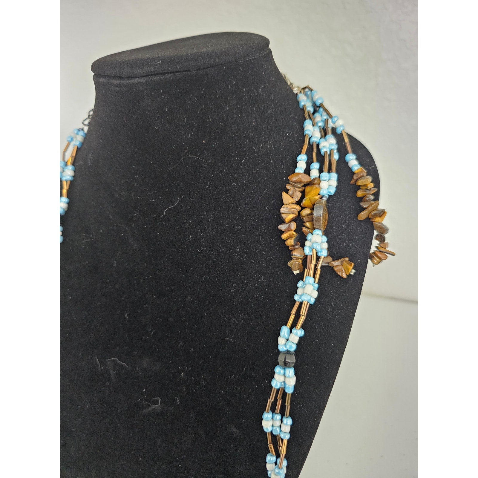 Vintage 1970s Multi Strand Long Necklace Blue and Brown Tones