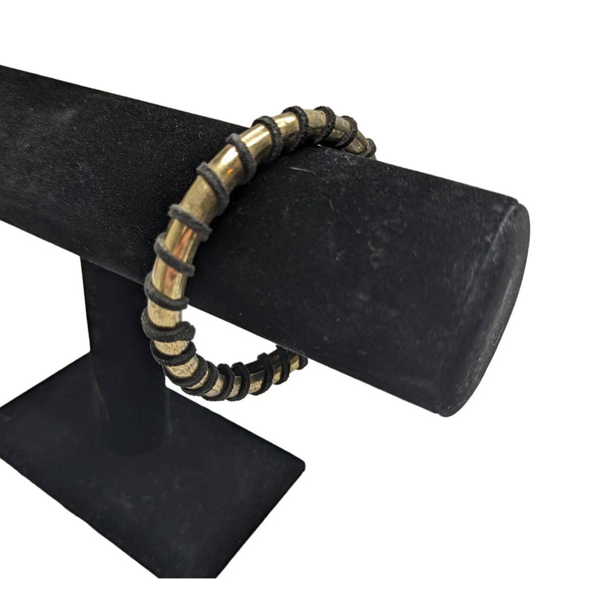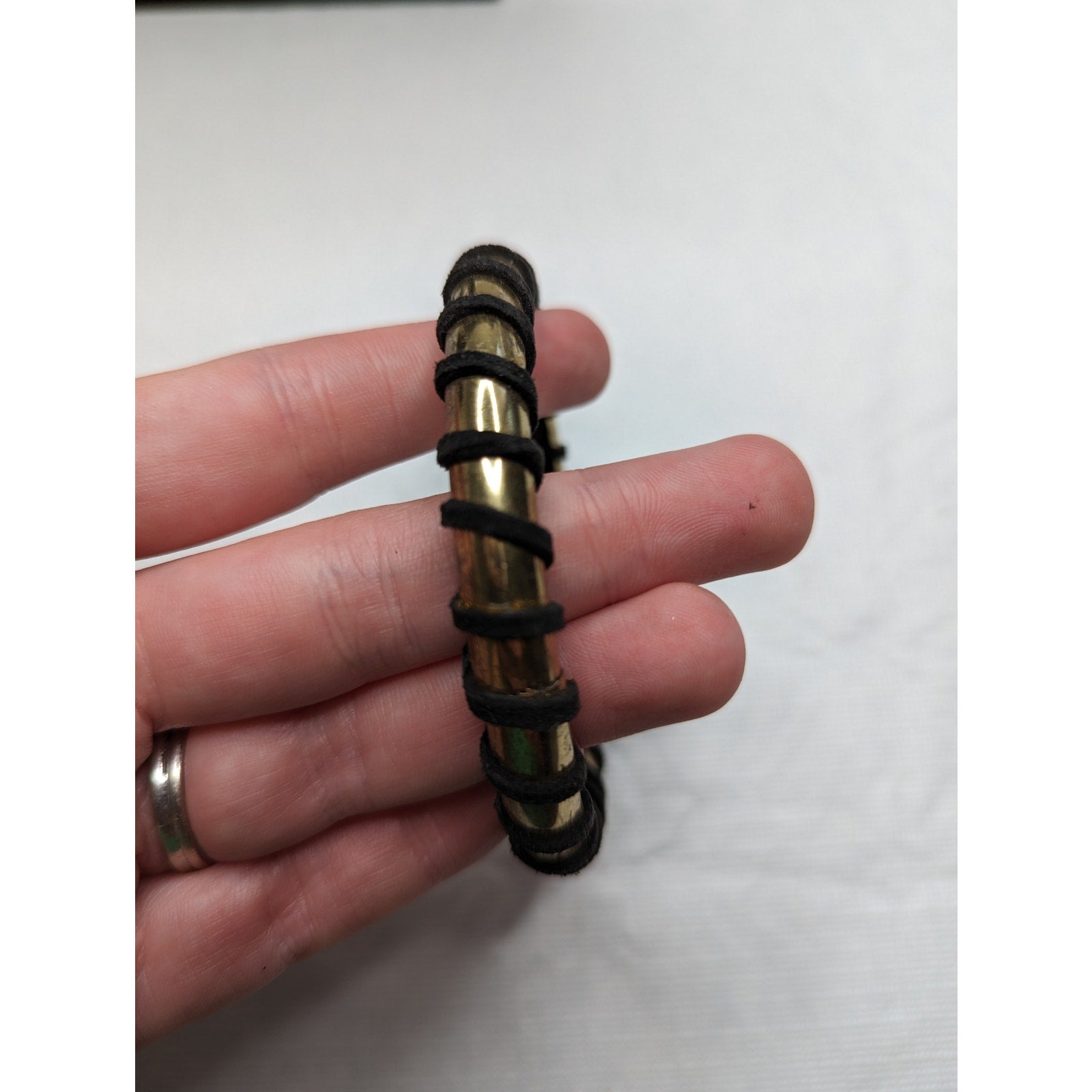 Vintage 1970s Womens Round Bangle Bracelet Fold Tone Leather Wrapped