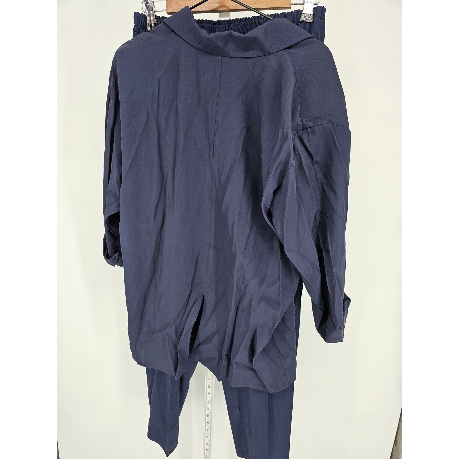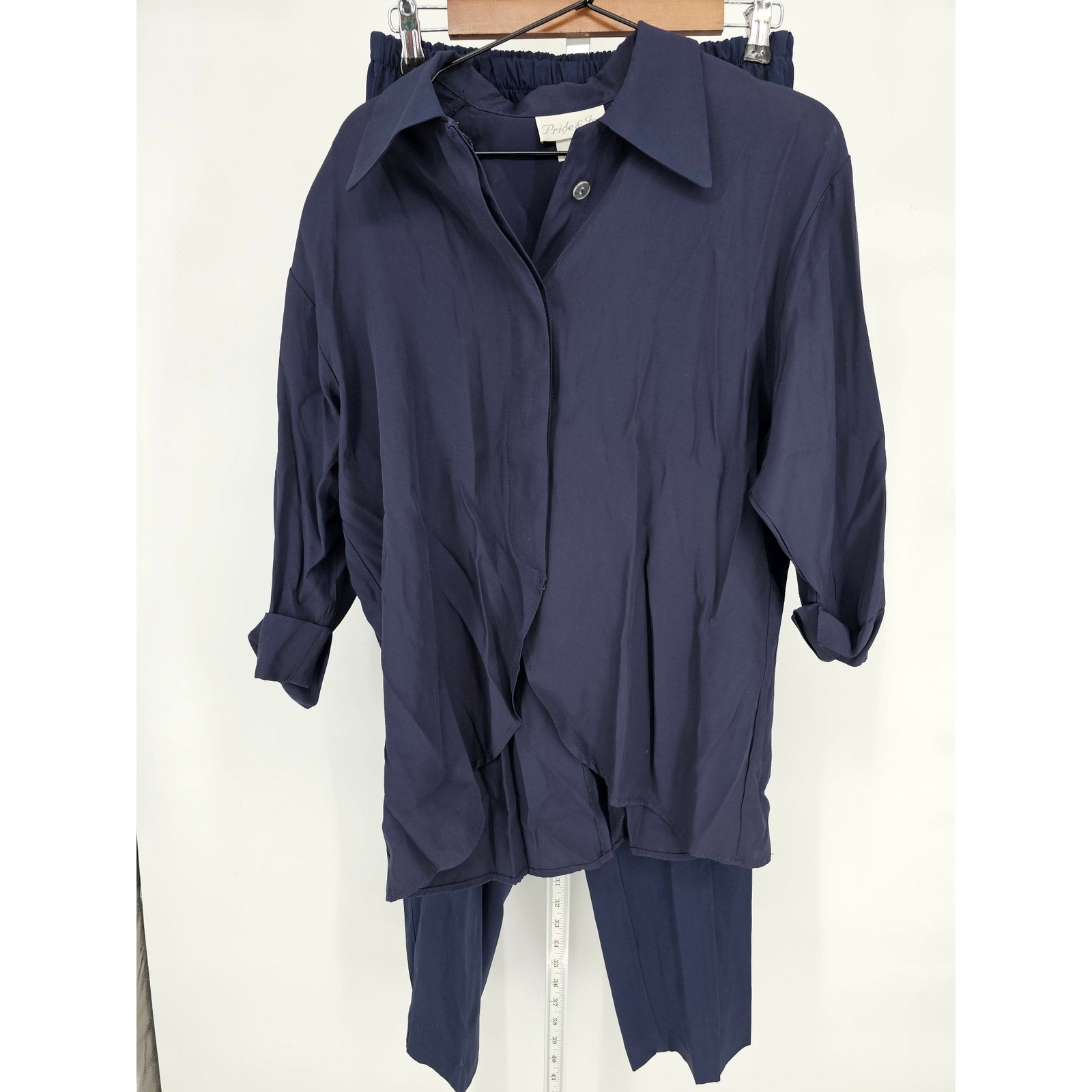 Vintage 1970s Womens Sz 12P Petite Satin Pants and Blouse Set Navy Blue