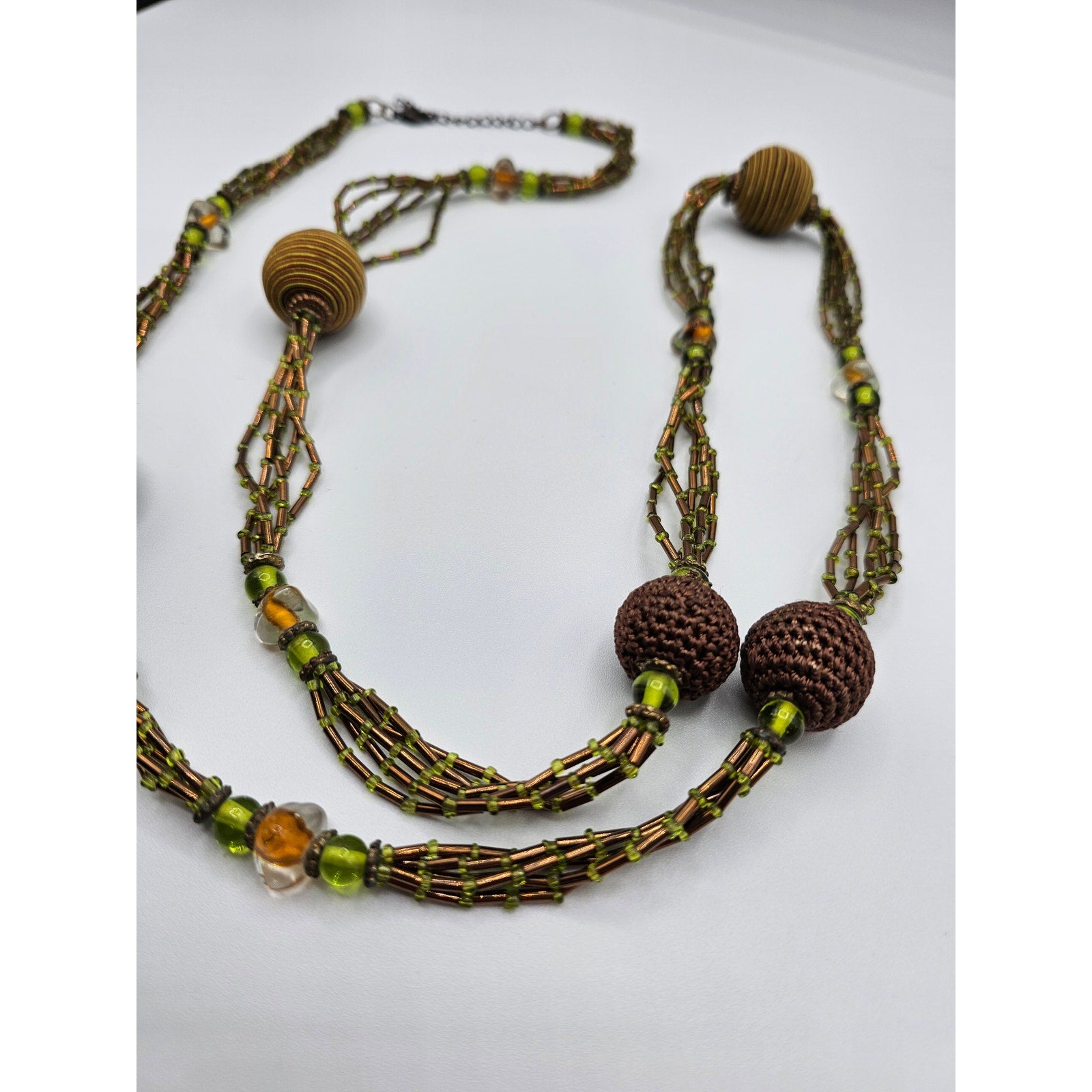 This vintage beaded necklace exudes a bohemian charm with its multi-strand design and intricate beadwork. Crafted in the 1980s, this piece is a perfect representation of the art to wear movement of the era. The golden hues of the beads complement each other beautifully and make for a stunning accessory that can elevate any outfit. Perfect for lovers of vintage and boho fashion, this necklace is a must-have for any collection.