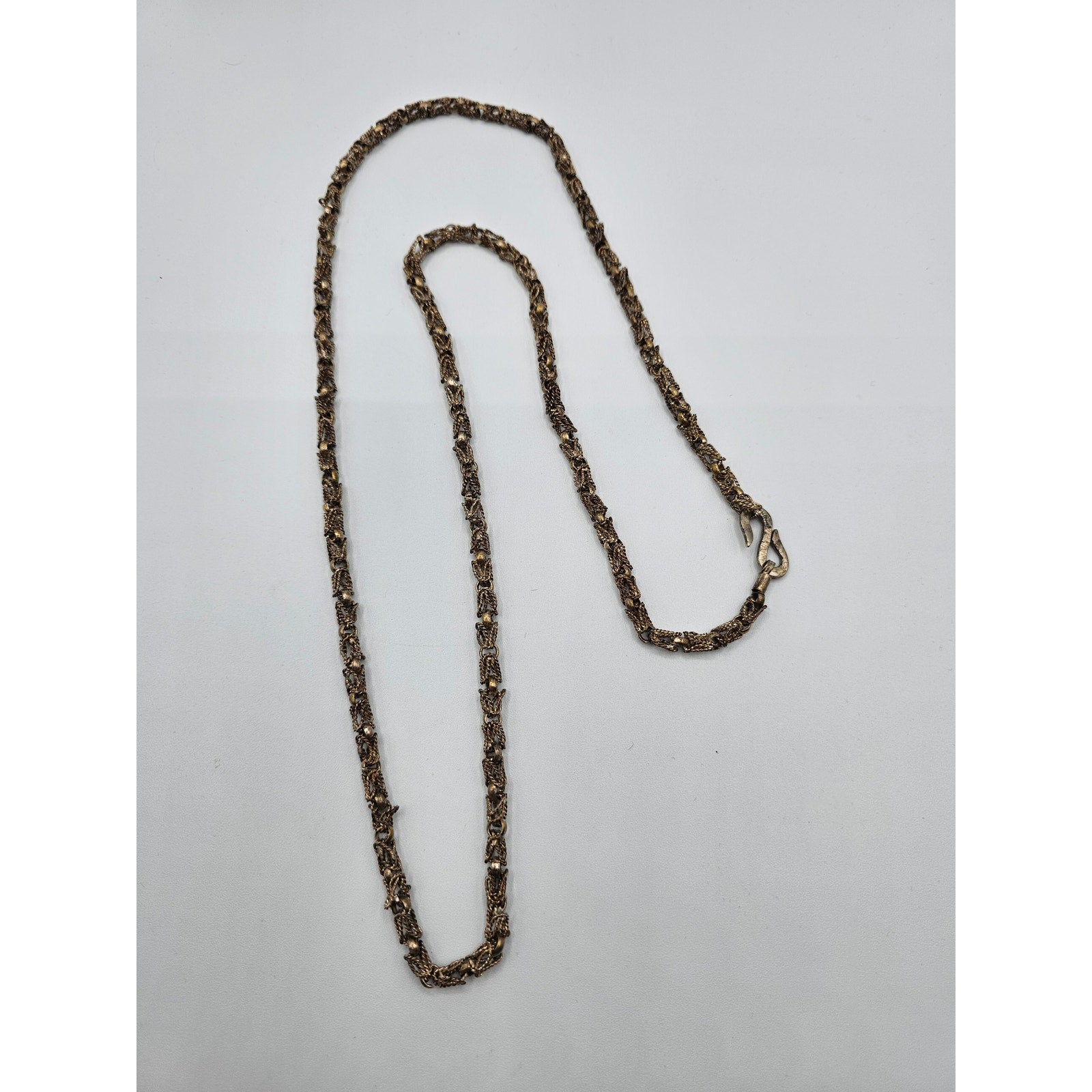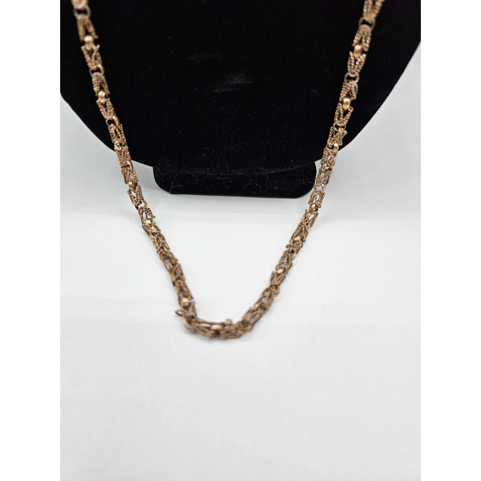 Add a touch of vintage glam to your collection with this delicate floral style necklace. The piece features a gold tone chain that complements the intricate floral design, making it a perfect accessory for any occasion. The necklace is from the 1980s and has a timeless appeal that will never go out of style. Crafted with high-quality materials, this necklace is durable and will last for years to come. The piece is perfect for those who love vintage accessories and want to add a touch of elegance to their outfit. Whether you are dressing up for a special occasion or want to add a touch of sophistication to your everyday look, this necklace is the perfect choice.