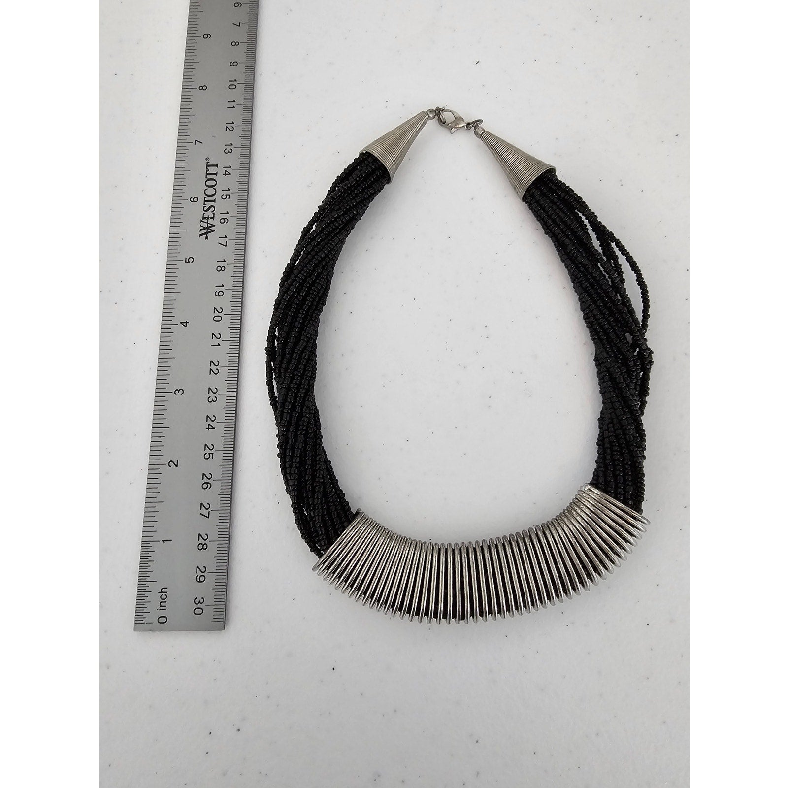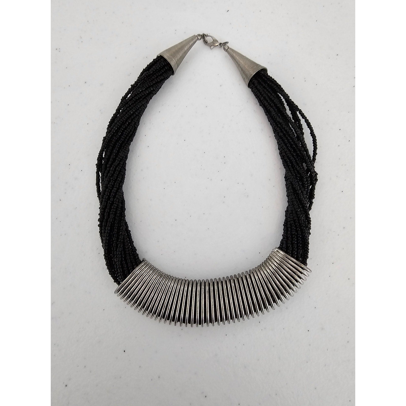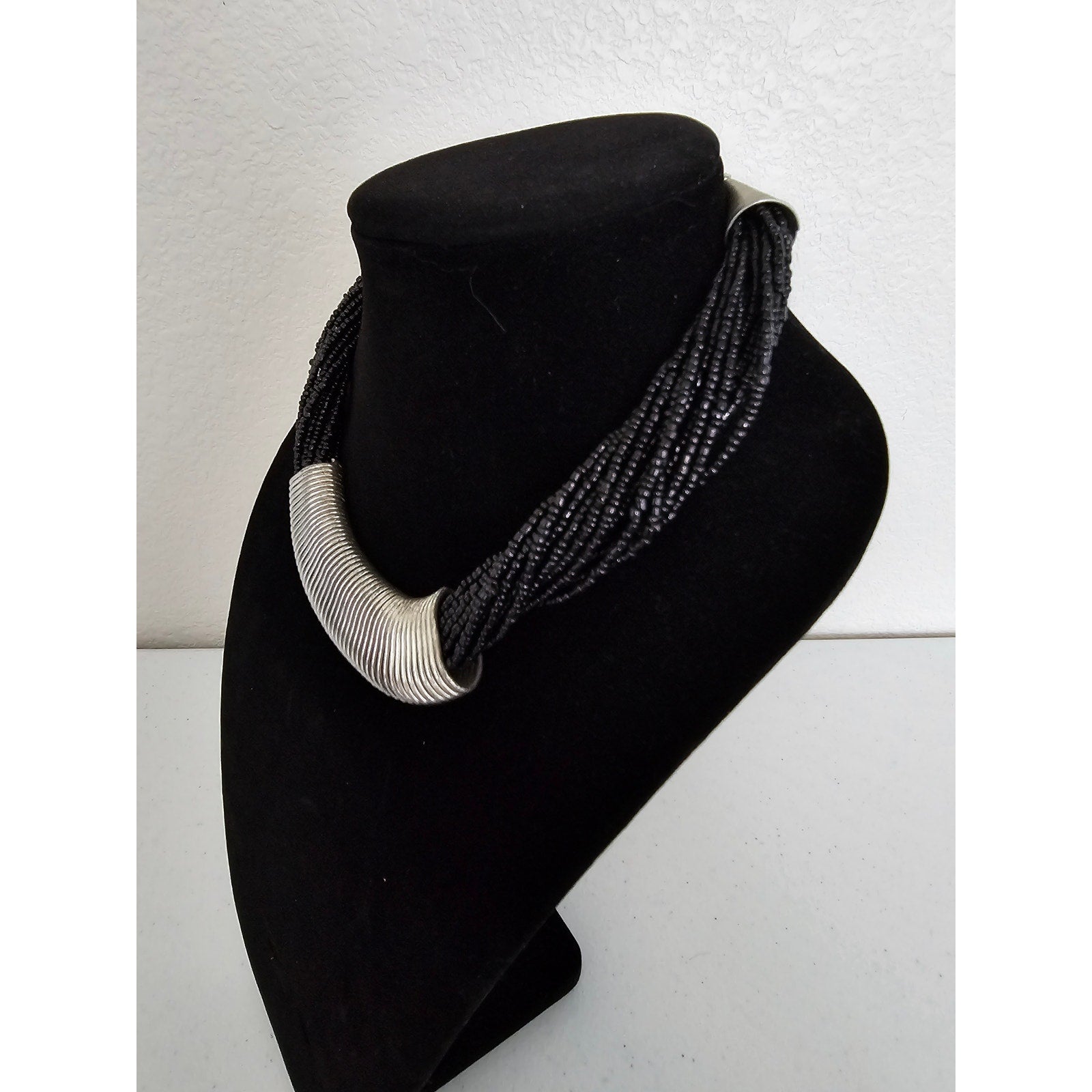 Vintage 1980s Milti Strand Seed Bead Necklace Black Silver Statement