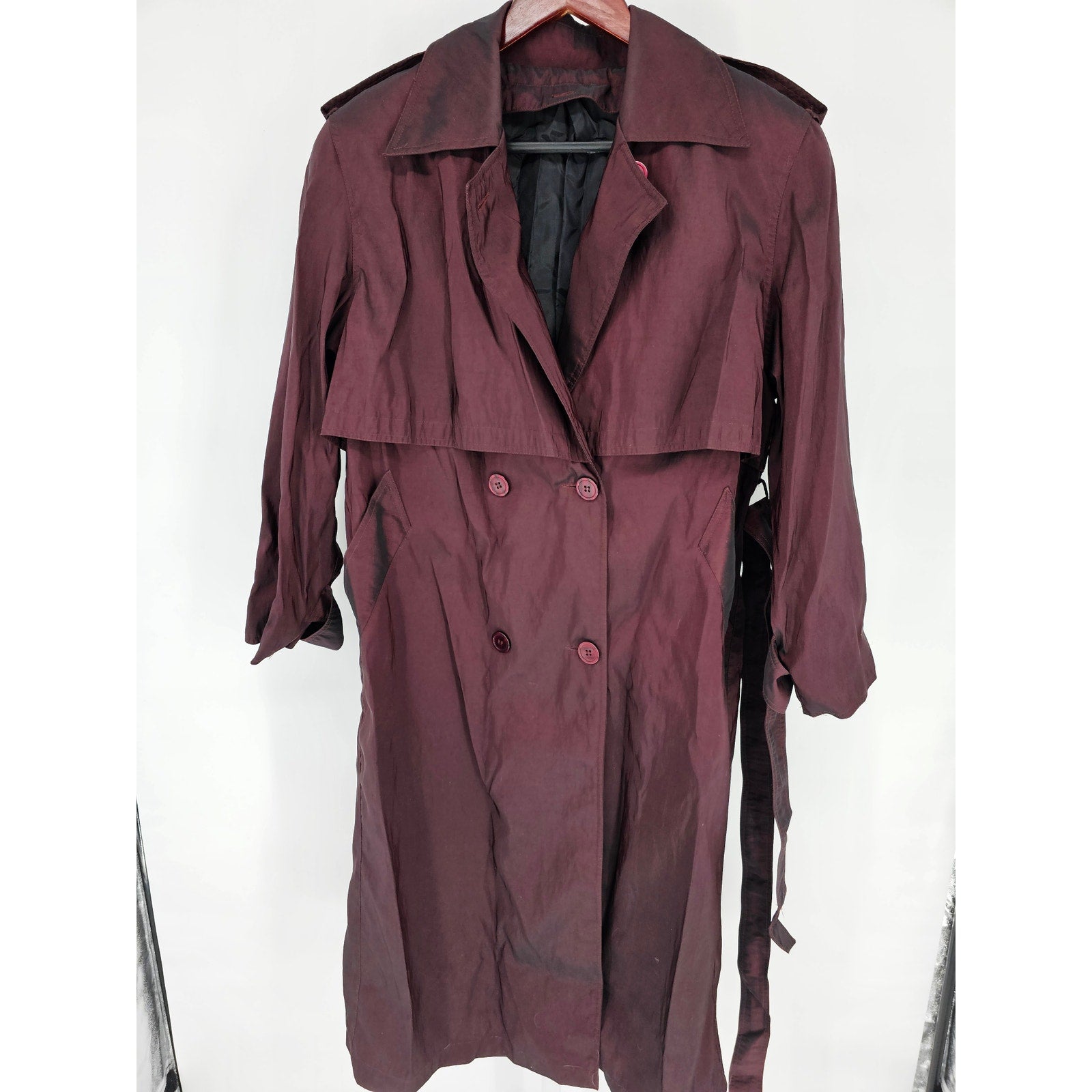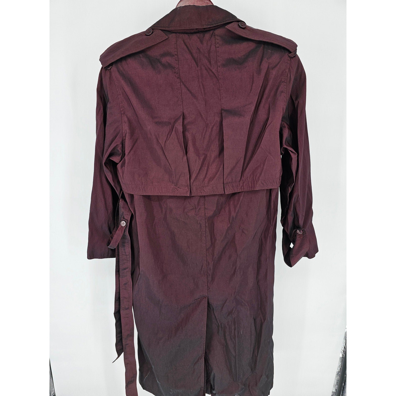 Vintage 1980s Womens Sz M Midi Length Trench Coat Purple Metallic Sheen Belted