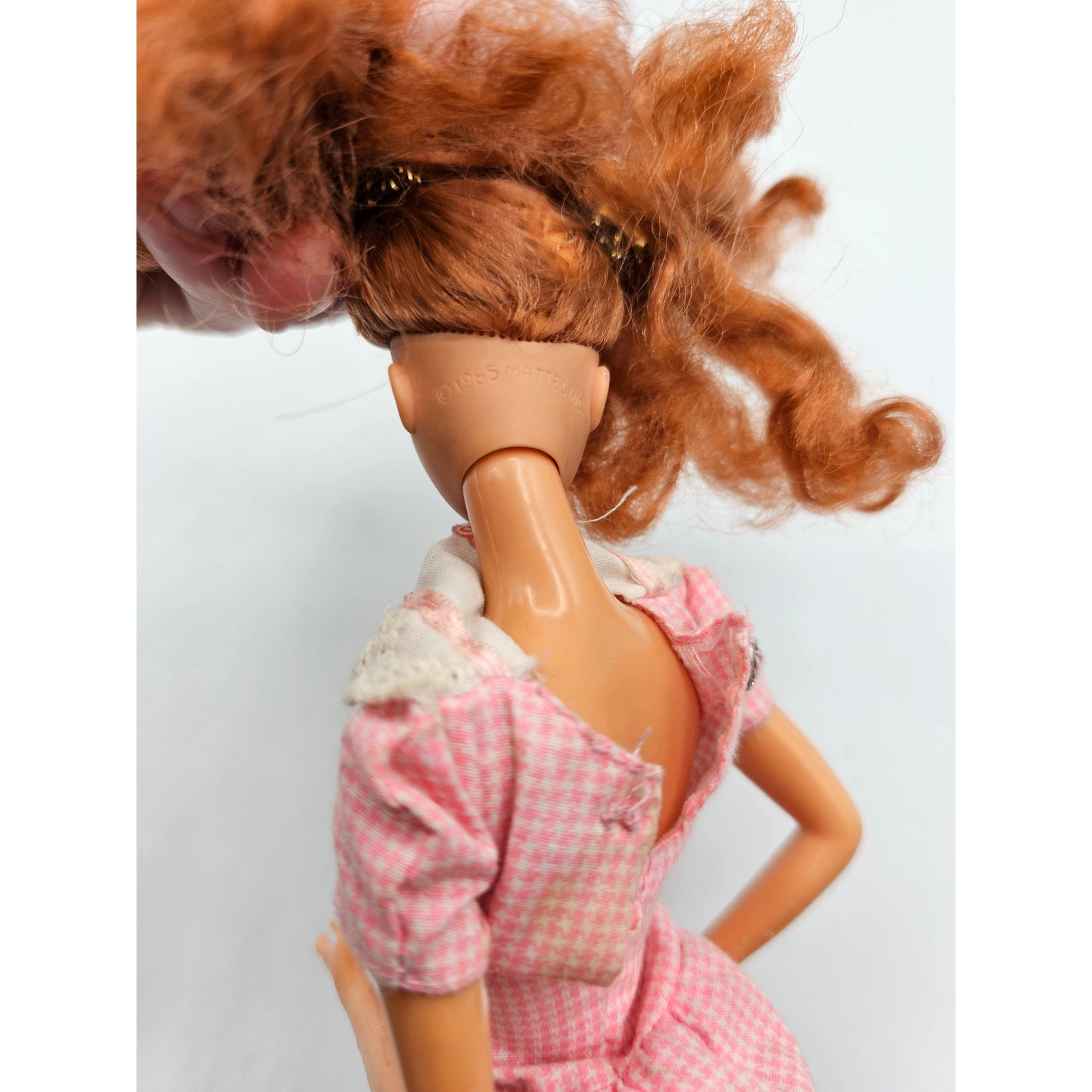 This vintage 1985 Mattel Barbie doll is a must-have for any collector or Barbie enthusiast. With her beautiful auburn curly hair and original pink dress, she is sure to be a standout addition to any collection. The doll is in great shape and ready for display or play. Perfect for those who love antiques or Barbie, this doll is a unique find. The pink dress is still in its original form and the curly hair adds a touch of charm to the overall look. This Barbie doll is sure to bring back memories of childhood and will make a great addition to any collection.