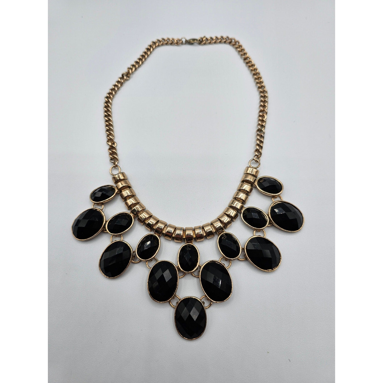 Elevate your jewelry collection with this vintage 1990s bib collar style necklace. The necklace features stunning gold tone metal and black rhinestones that will add a touch of sophistication to any outfit. Perfect for collectors of antique jewelry or anyone who appreciates unique and stylish accessories. This piece is sure to become a favorite in your collection.