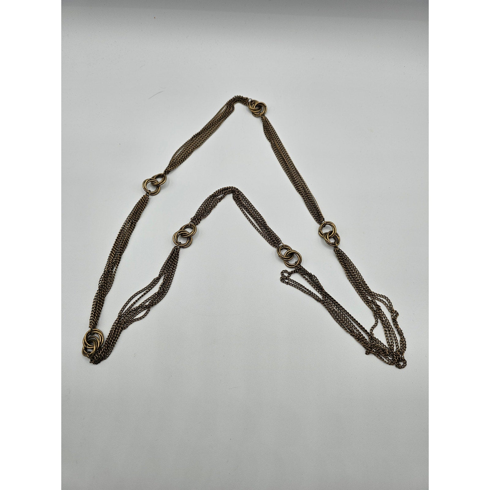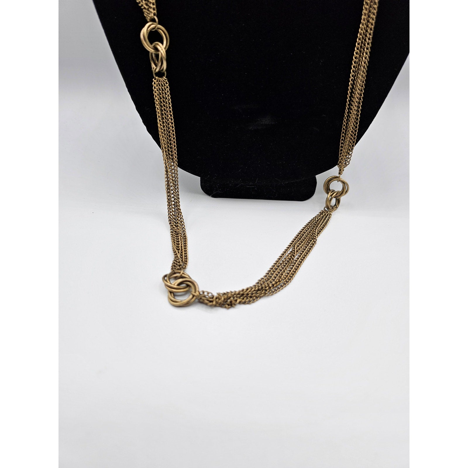 This vintage necklace is a true gem from the 1990s. With its brushed gold finish and multi-strand design, it is sure to catch the eye of anyone who sees it. The necklace is perfect for those who love antiques and want to add a touch of vintage charm to their wardrobe. Crafted with care and attention to detail, this necklace is a testament to the quality of jewelry from this time period. The brushed gold finish gives it a luxurious and elegant look, while the multi-strand design adds a unique and playful touch. This necklace is perfect for any occasion and would make a great addition to any jewelry collection.