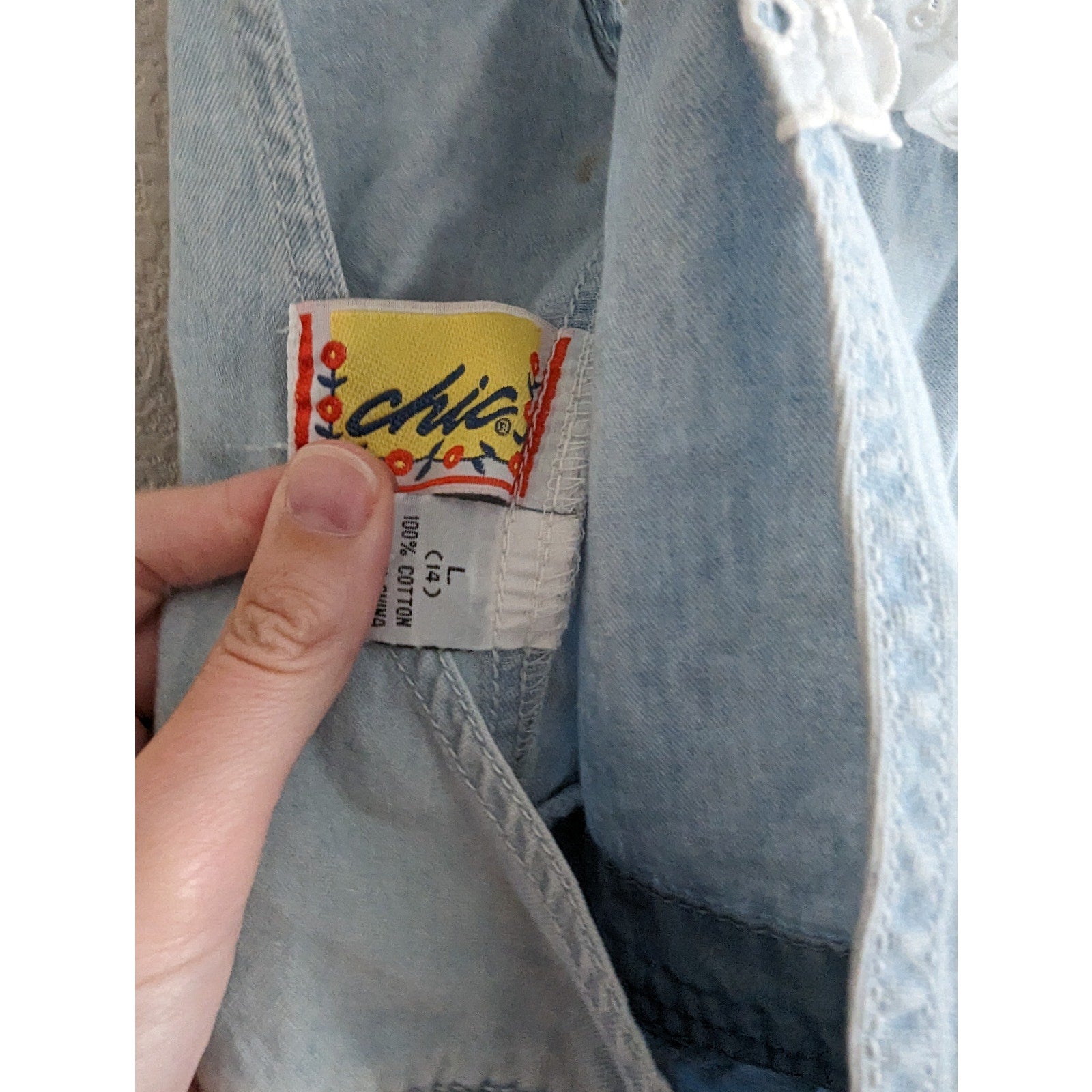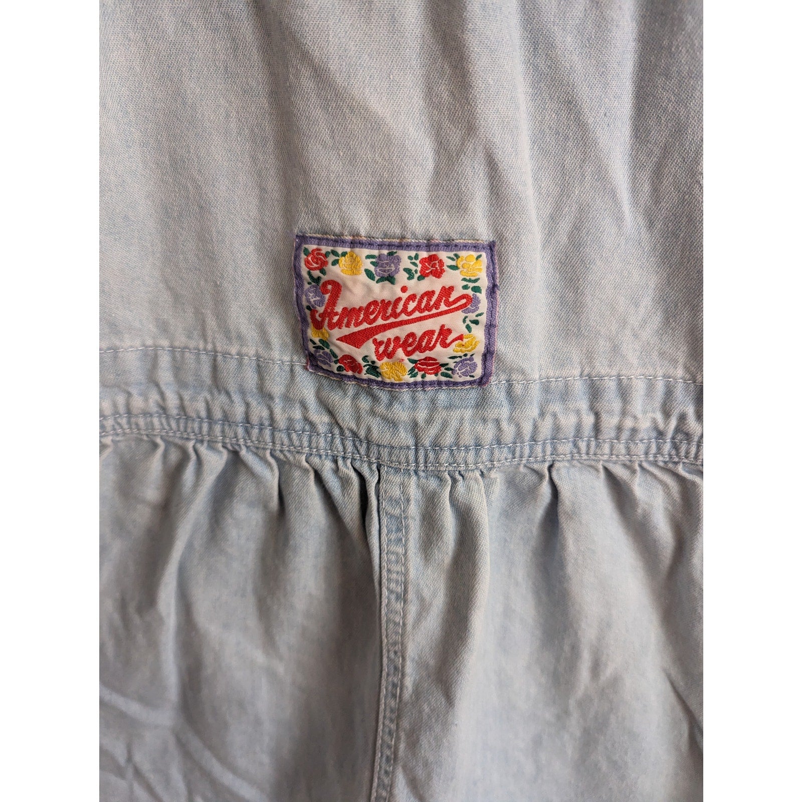 Vintage 1990s Girls Sz 14 Shortalls Overalls Blue Chambray Lace Trim