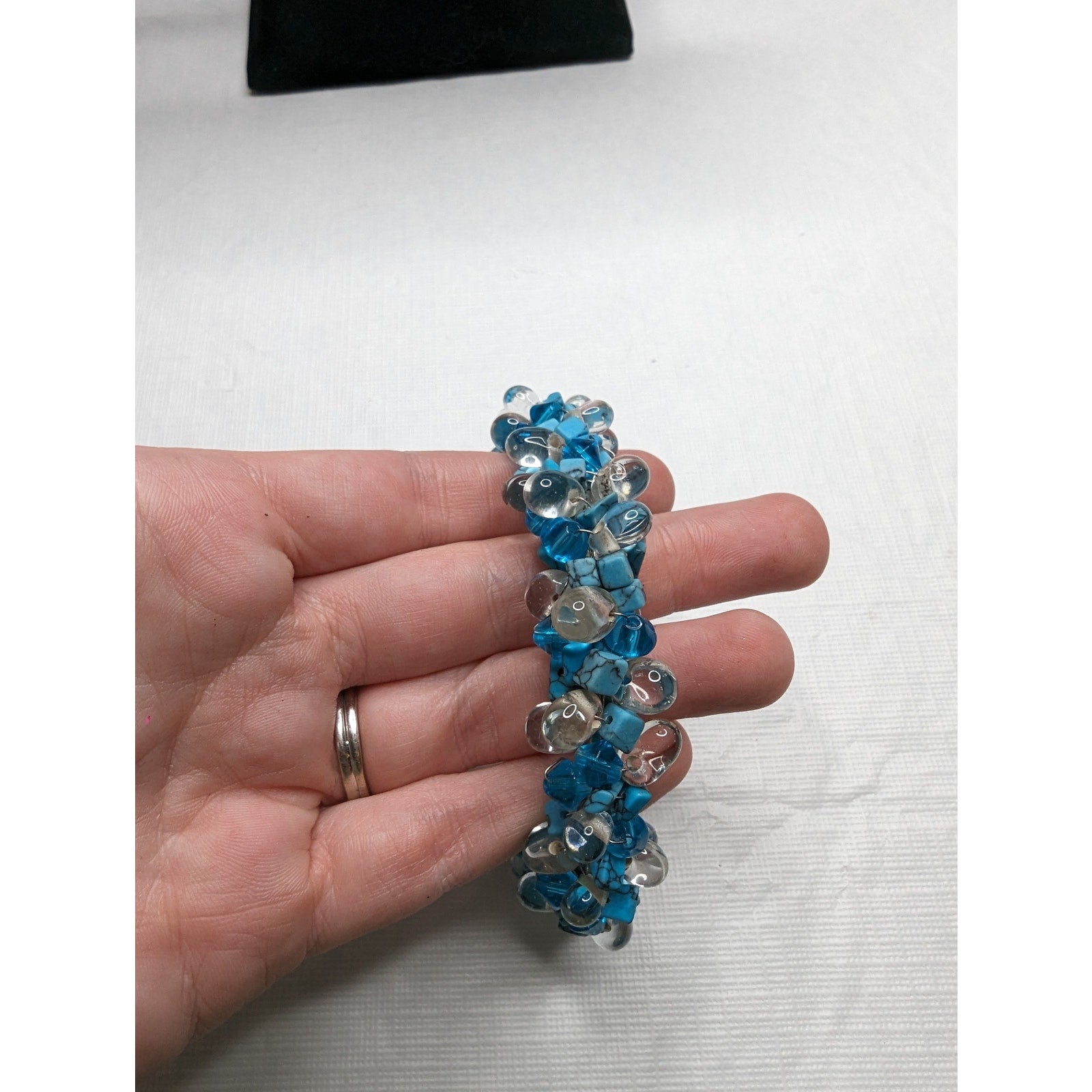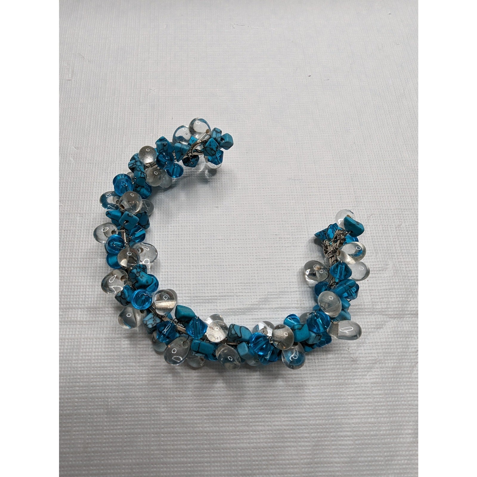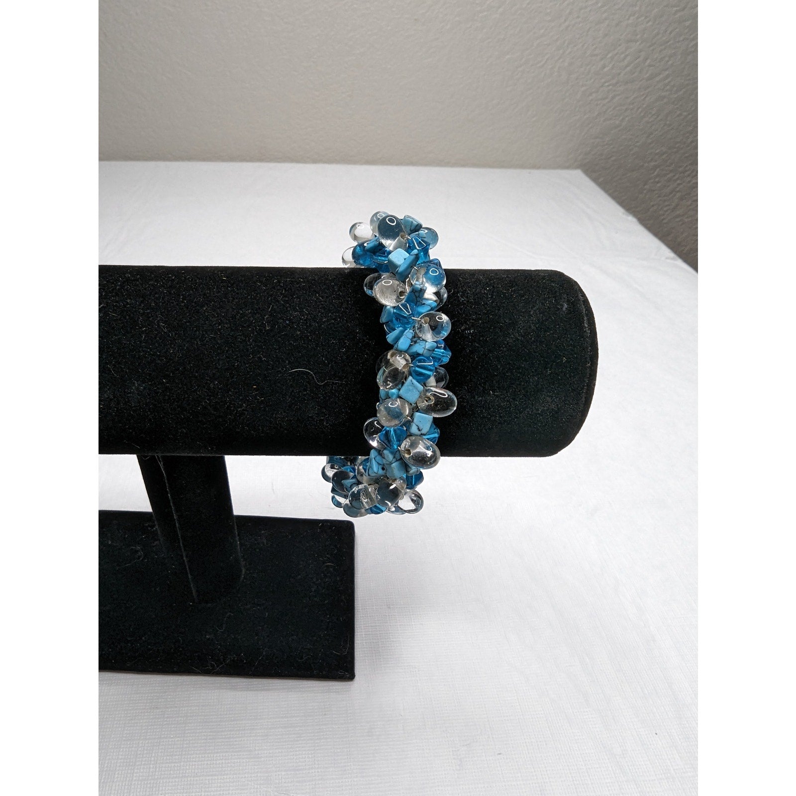 Vintage 1990s Glass Beaded Bangle Bracelet Blue and Clear Beads
