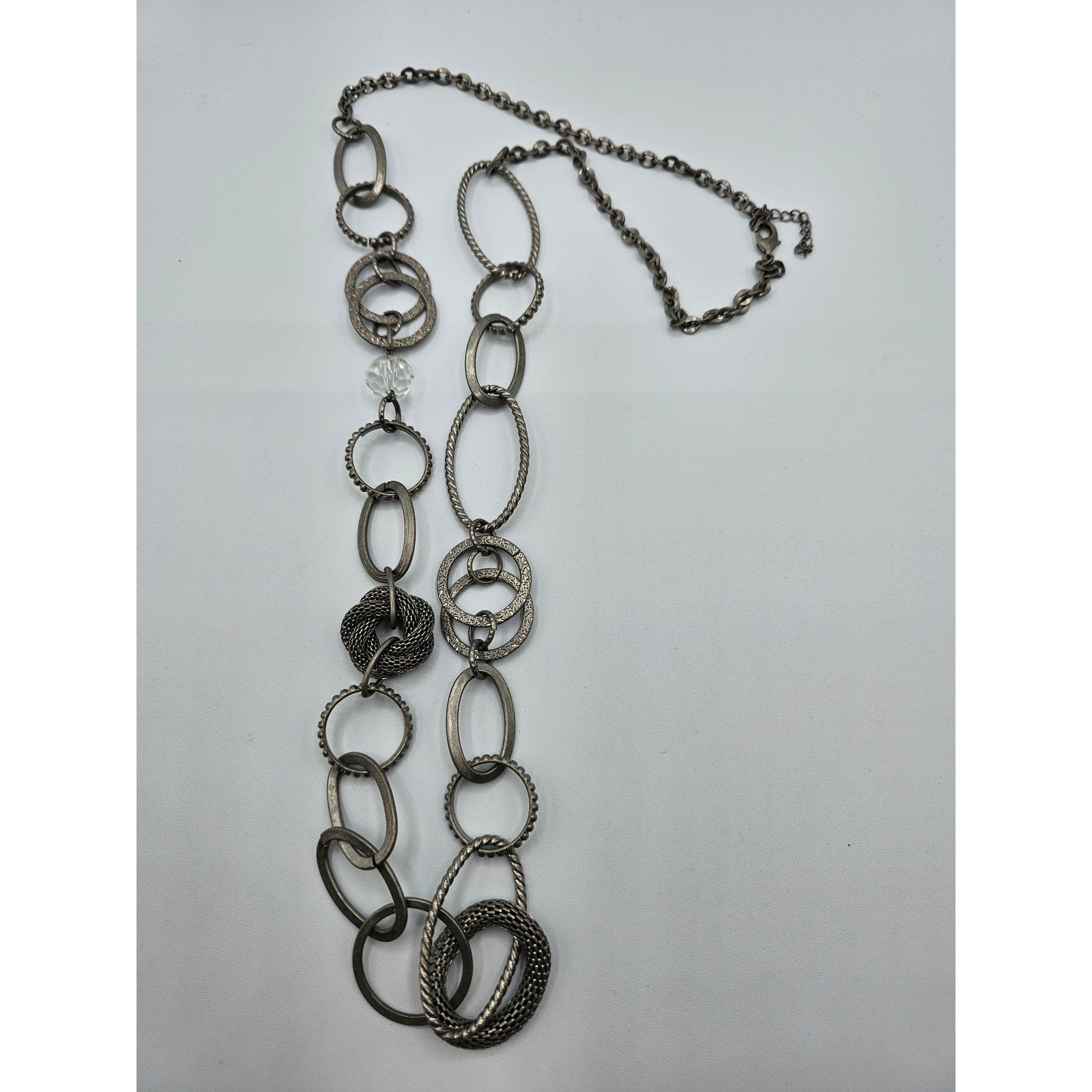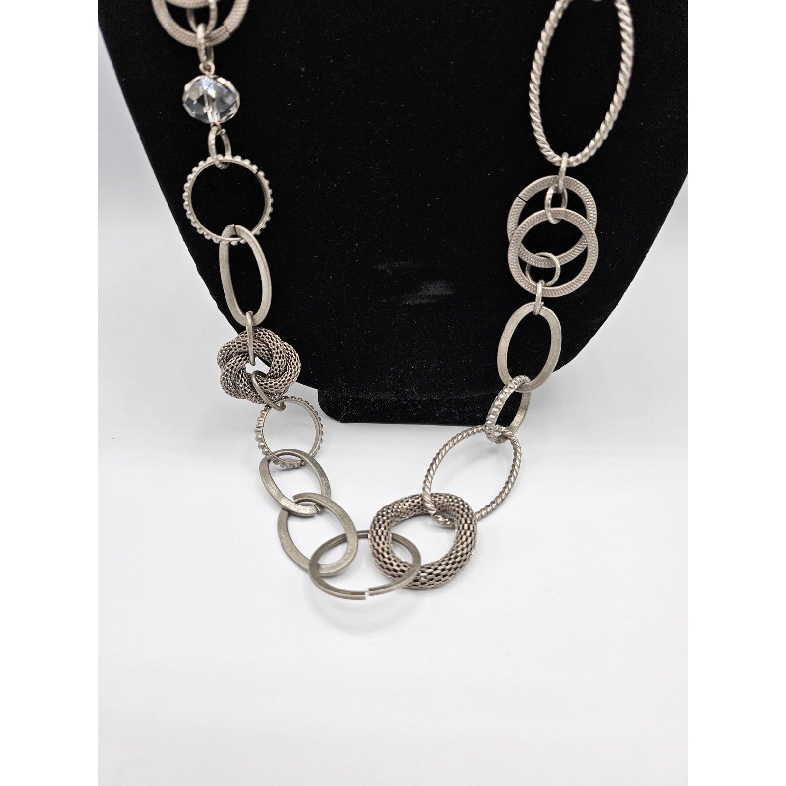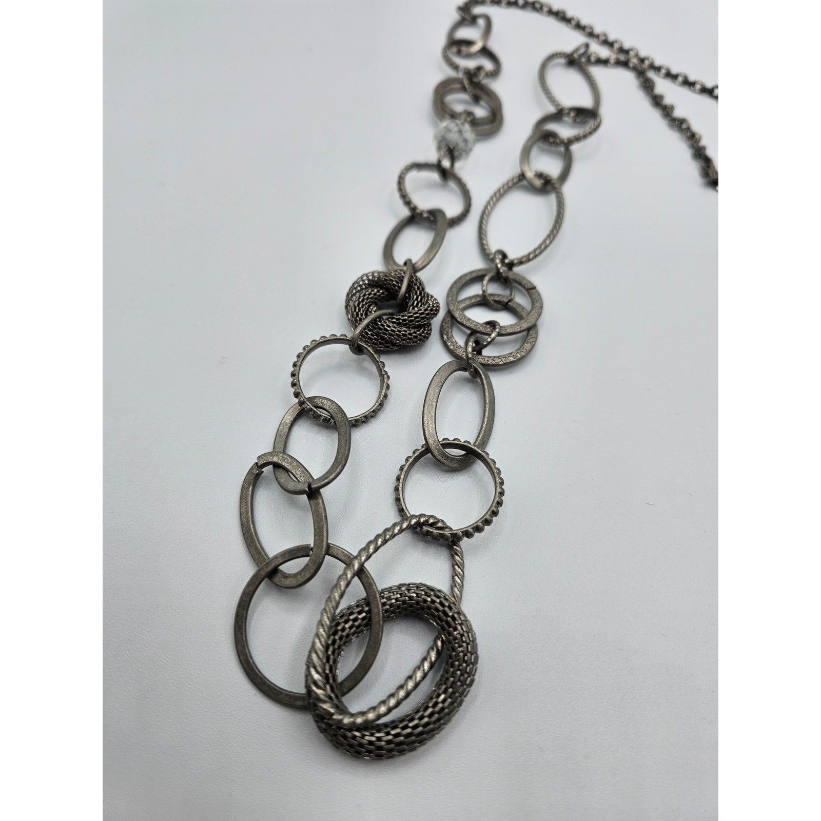 This vintage necklace is a stunning piece that will make you stand out from the crowd. With its silver tone and long single strand chain, it is perfect for any occasion. The necklace is a unique antique piece that will add a touch of elegance to your outfit. It is perfect for those who love vintage fashion and want to make a statement. The necklace is a great addition to any collection and will make a perfect gift for someone special. It is perfect for those who love antiques and want to add a touch of history to their wardrobe. The necklace is a must-have for anyone who wants to make a statement with their fashion sense.