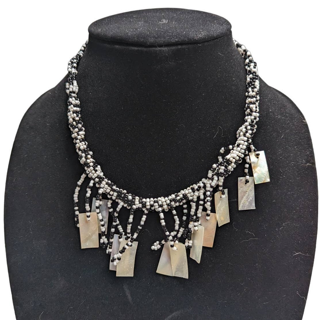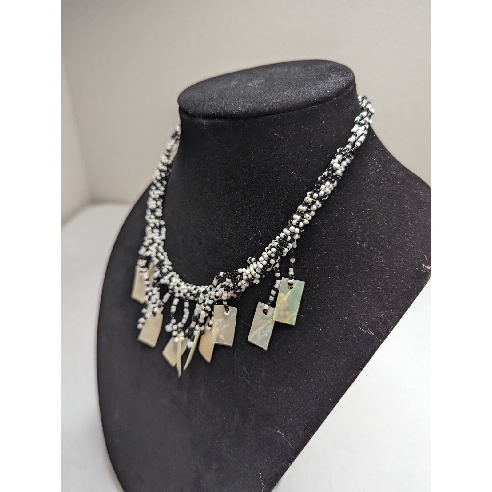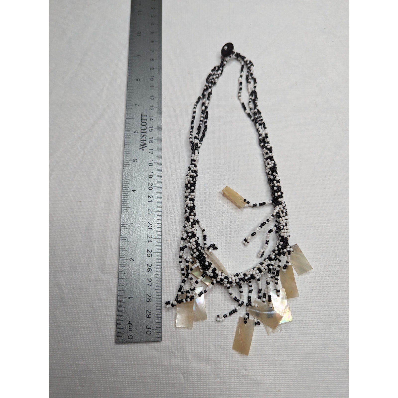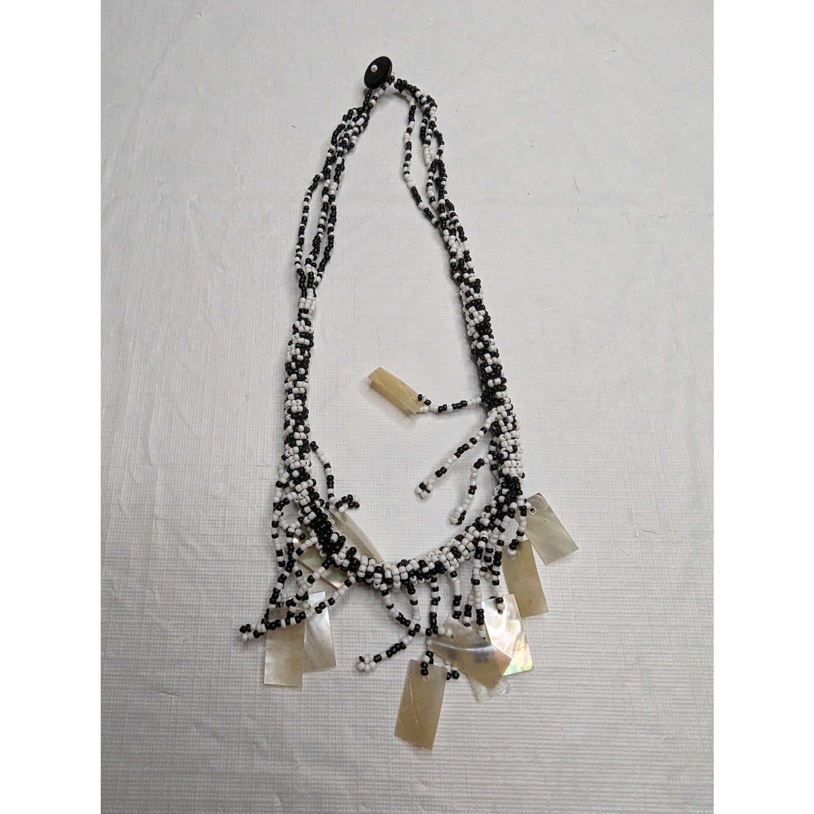 Vintage 1990s Multi Strand Seed Bead Necklace Black White w/ Mother of Pearl