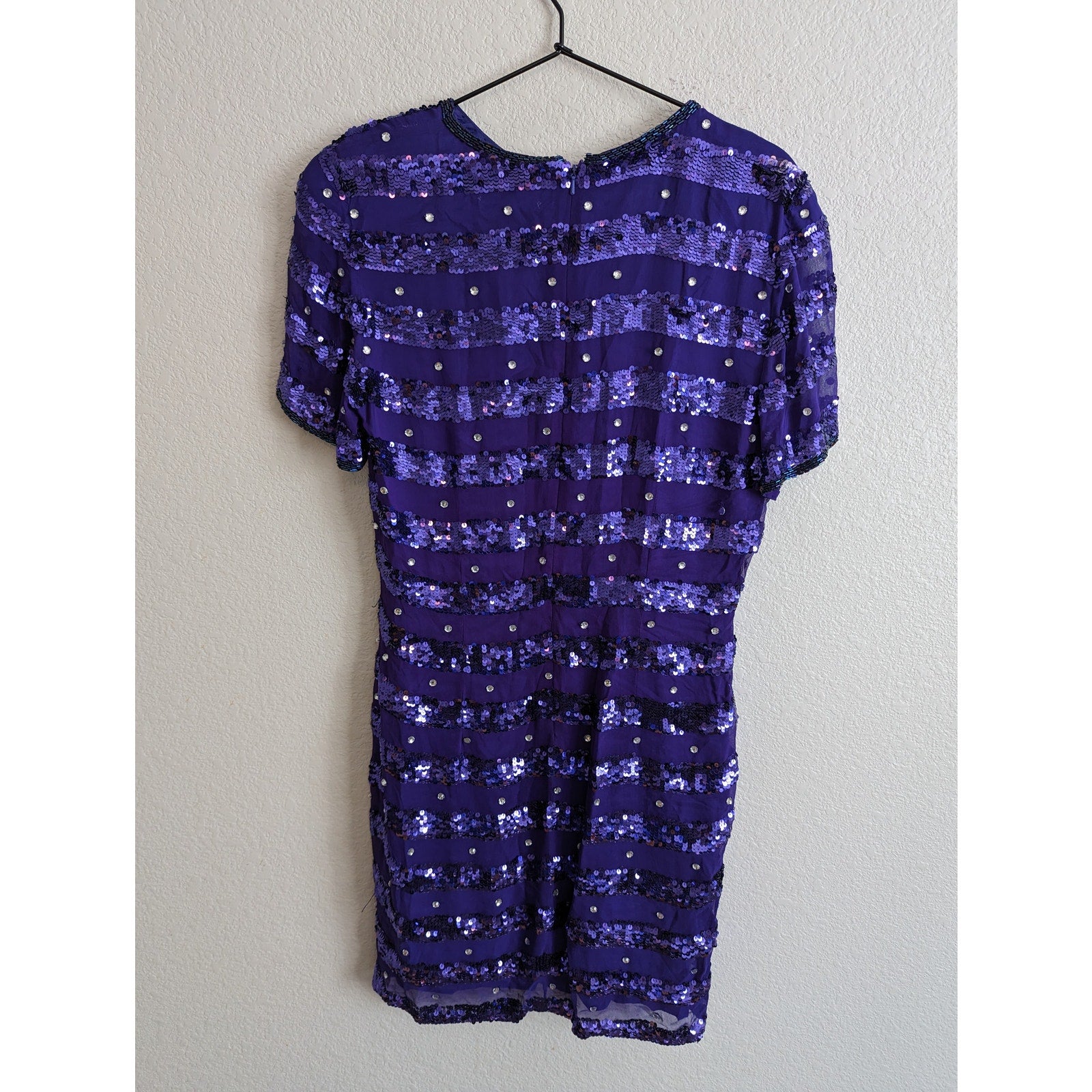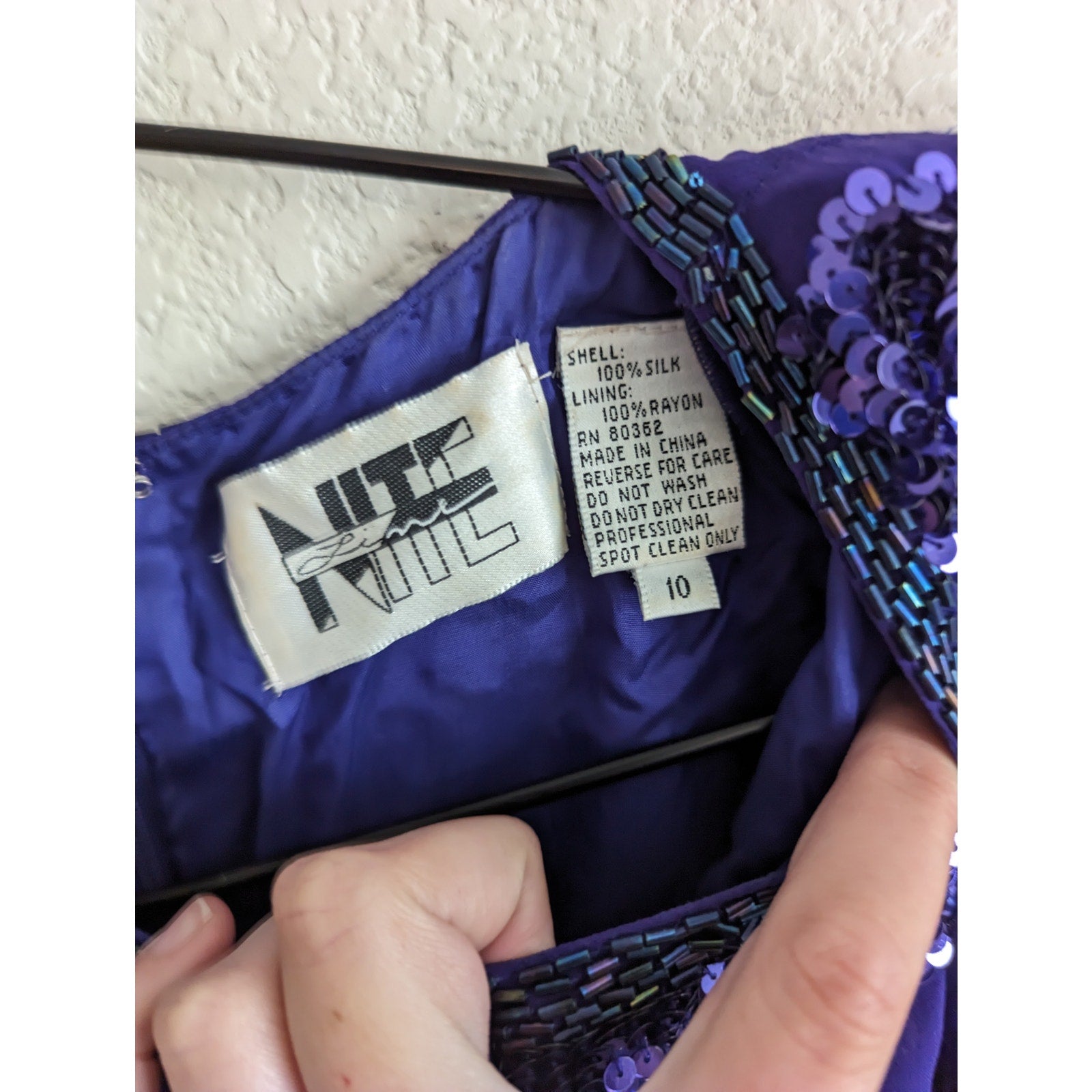 Vintage 1990s Nite Line Sz 10 Knee Length 100% Silk Dress Fully Beaded Purple