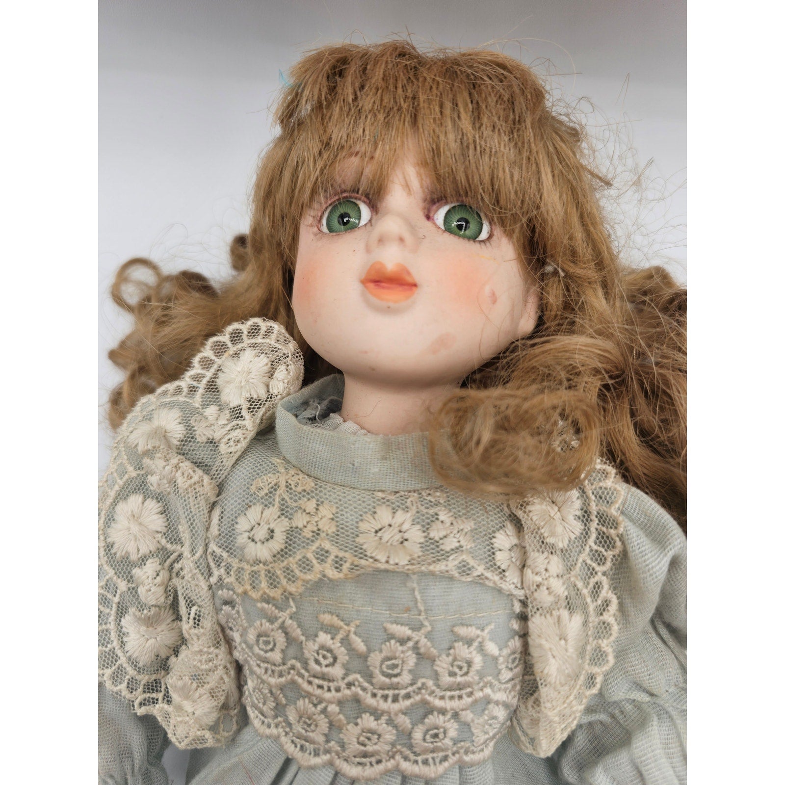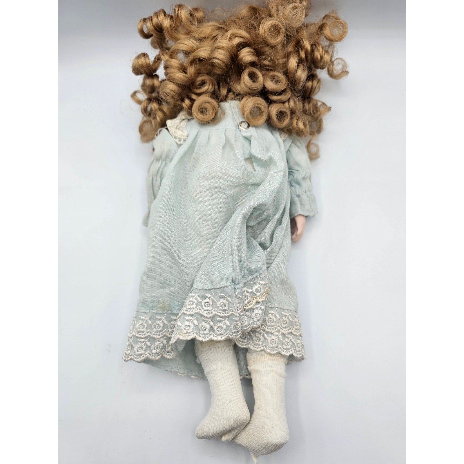 This vintage porcelain doll is sure to delight any collector with its charming features and adorable outfit. A true classic from the 1990s, this doll boasts a beautiful light blue dress and brown hair, which are sure to make it a standout piece in any collection. With a cloth body to support its delicate porcelain features, this doll is both lovely and durable, ensuring that it will last for years to come.