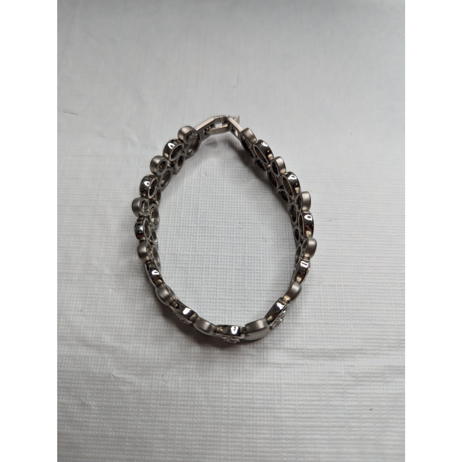 This vintage bracelet from the 1990s boasts a stunning silver tone and is adorned with shimmering rhinestones. The two-layer clasp design adds an extra touch of elegance to this piece. It is a perfect addition to any jewelry collection and is sure to add a touch of sophistication to any outfit.