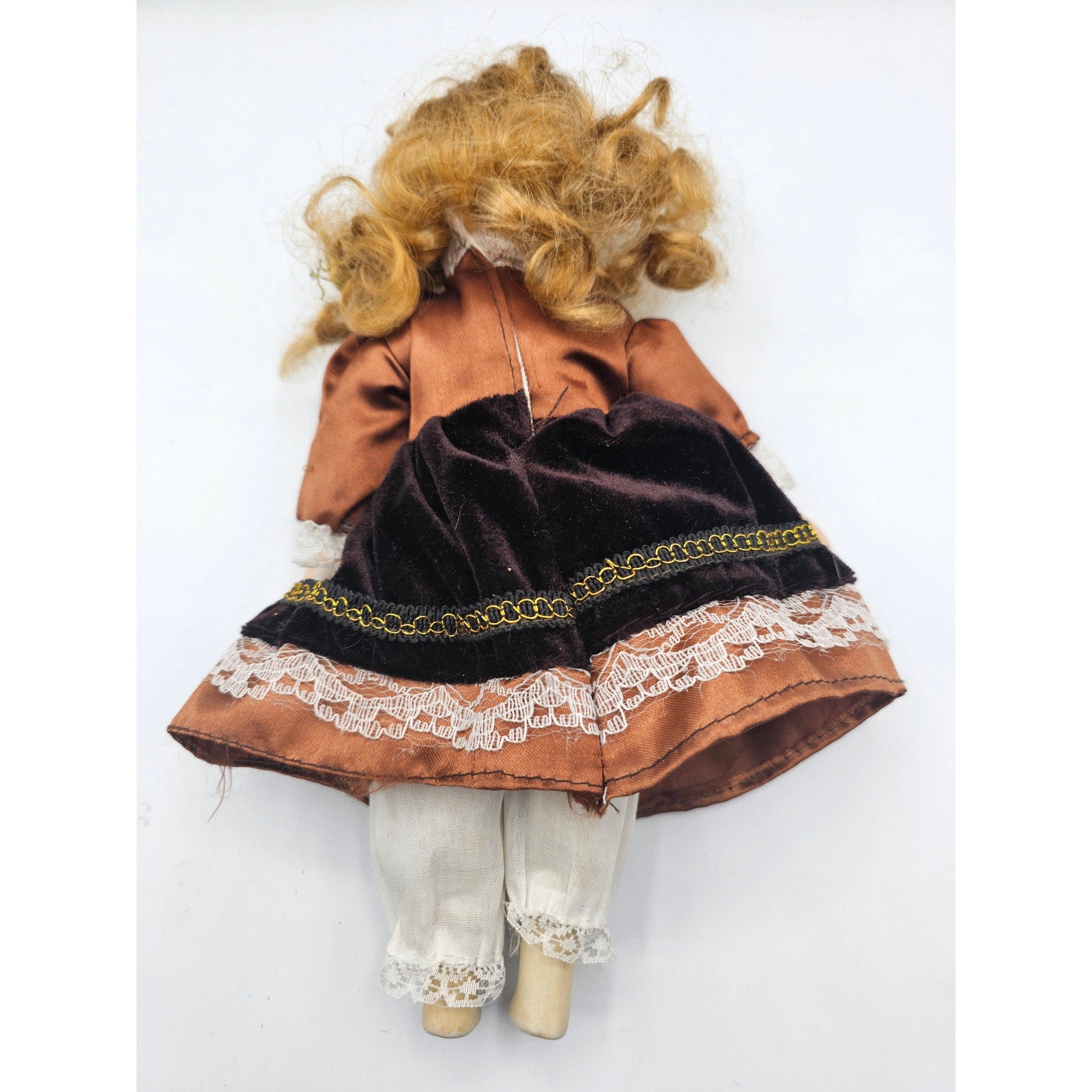 Vintage 1990s Small Porcelain Doll Black Gold Velvet Dress Strawberry Blonde