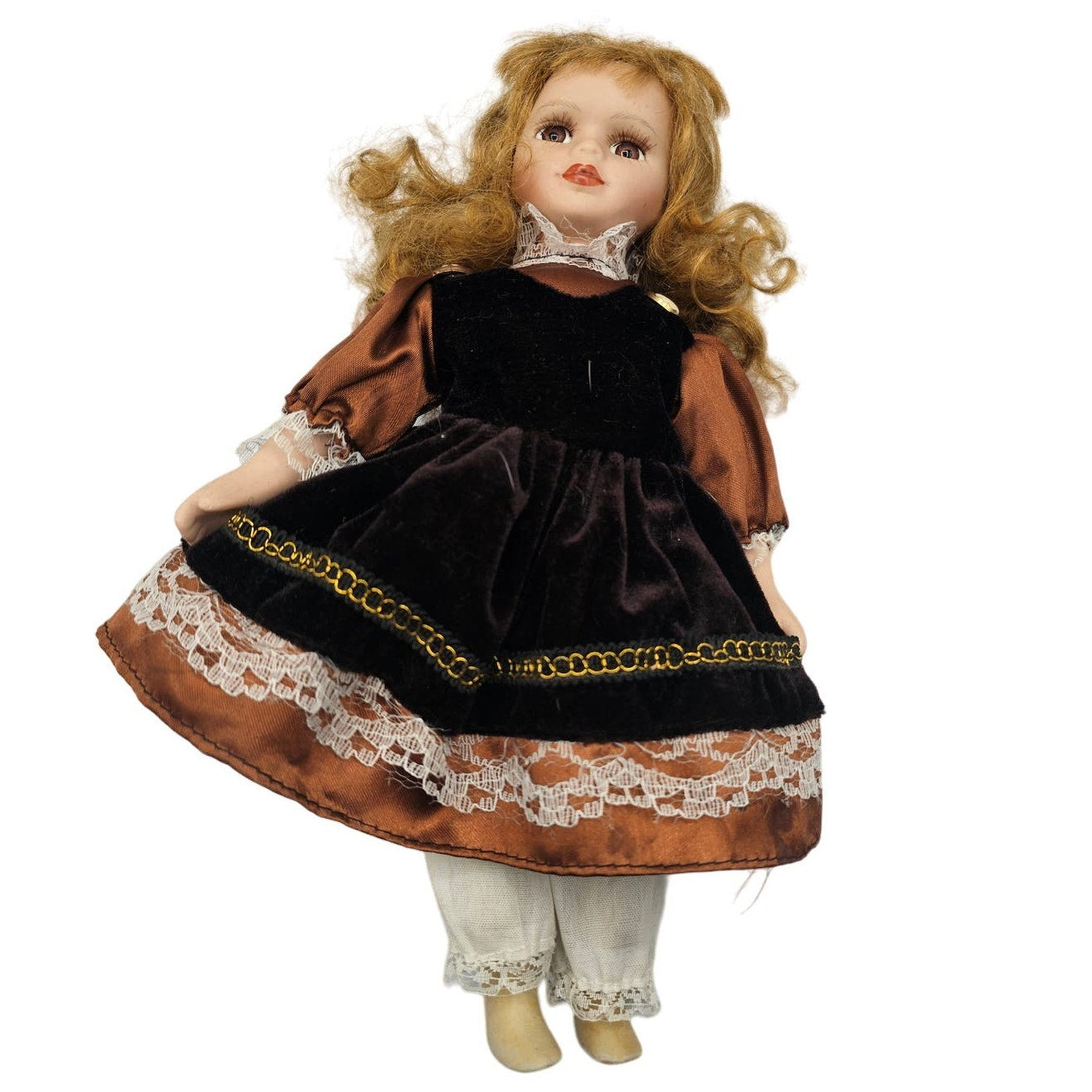 This vintage porcelain doll from the 1990s is a charming addition to any antique collection. Dressed in a stunning black and gold velvet dress, she is sure to catch the eye of any admirer. Her delicate features are perfectly complemented by her strawberry blonde hair, adding to the overall elegance of this piece. The doll's size makes her an ideal addition to any display case or shelf, and her timeless design ensures that she will remain a cherished item for years to come. Whether you are a collector of antique dolls or simply appreciate their beauty, this vintage porcelain doll is a must-have for your collection.