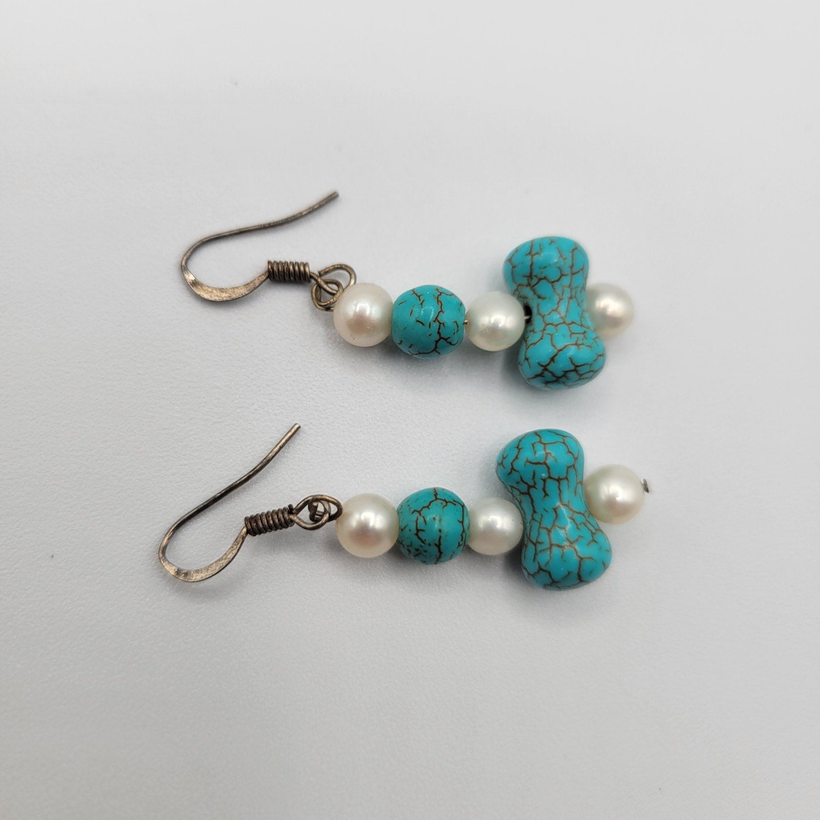 Vintage Y2K French Hook Earrings Turquoise Teal Stone w/ Pearls