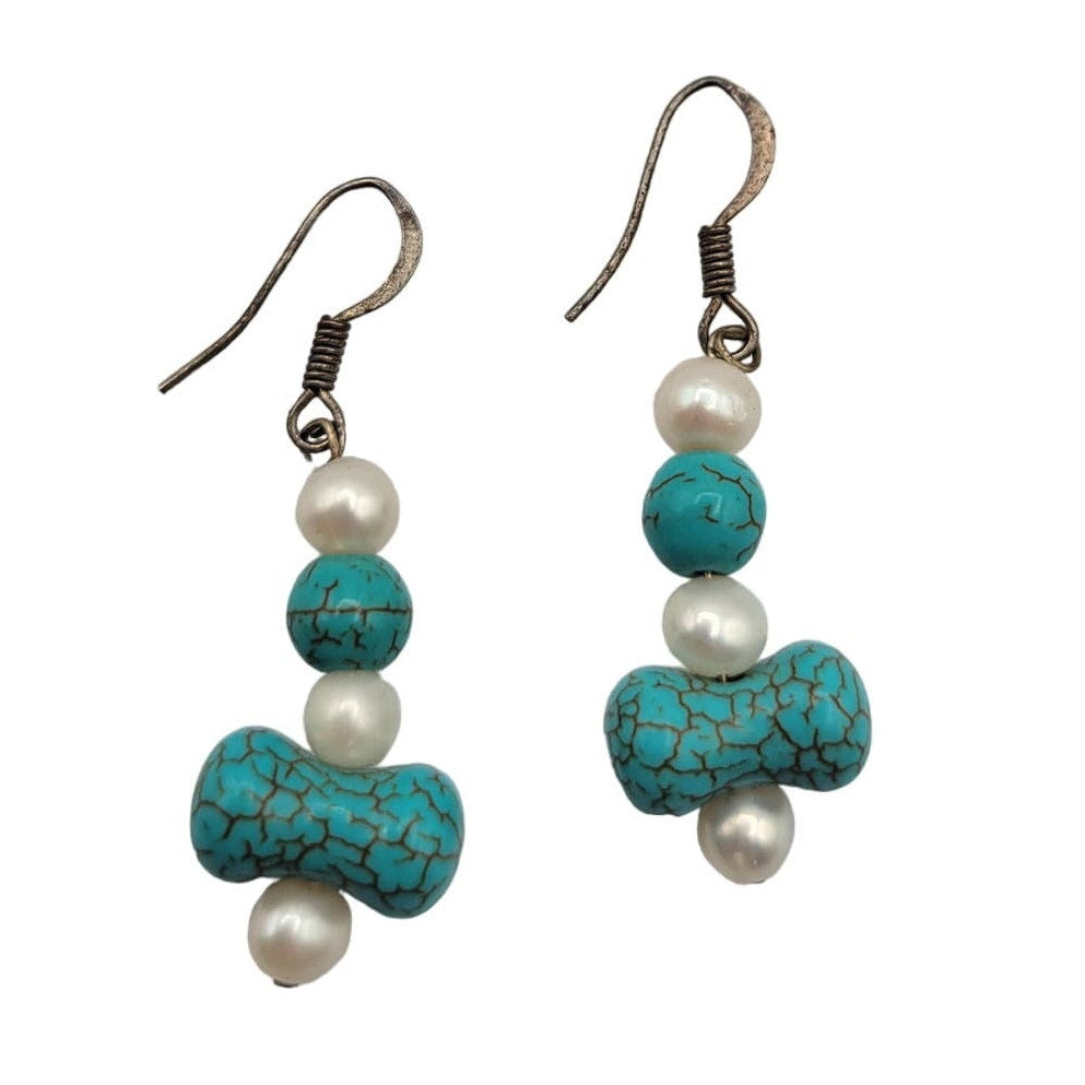 Add a touch of vintage elegance to your outfit with these stunning French hook earrings. The beautiful turquoise and teal stones are perfectly complemented by the delicate pearls, creating a unique and eye-catching piece of jewelry. These earrings are perfect for any occasion, whether it's a formal event or just a casual day out.