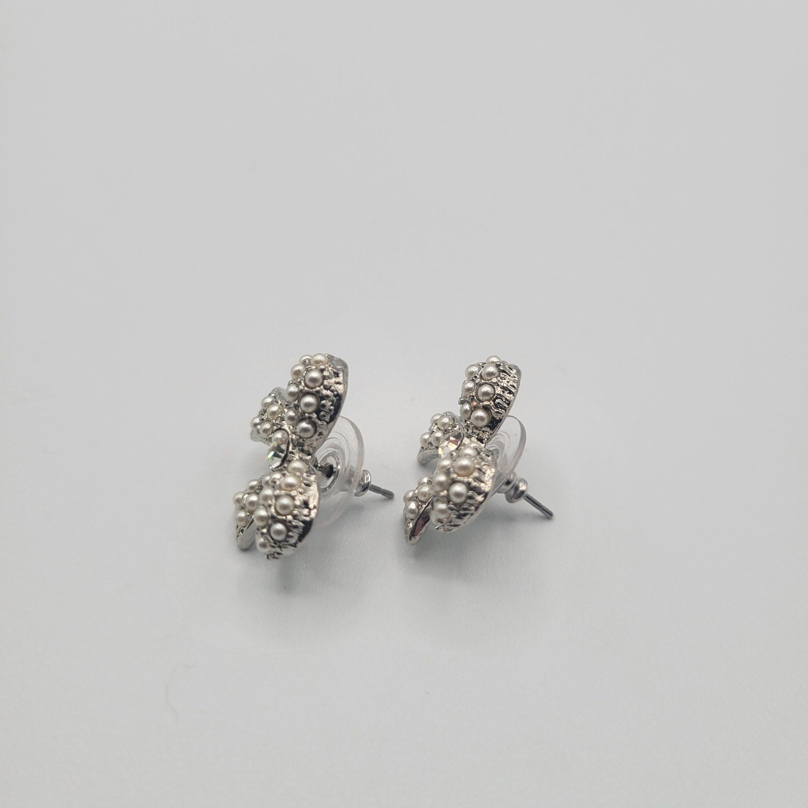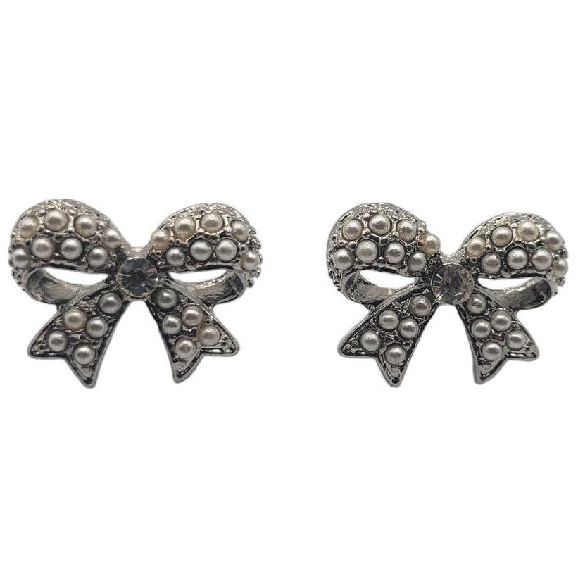 Vintage 1990s Silver Tone Bow Shaped Stud Back Earrings Faux Pearl Accents