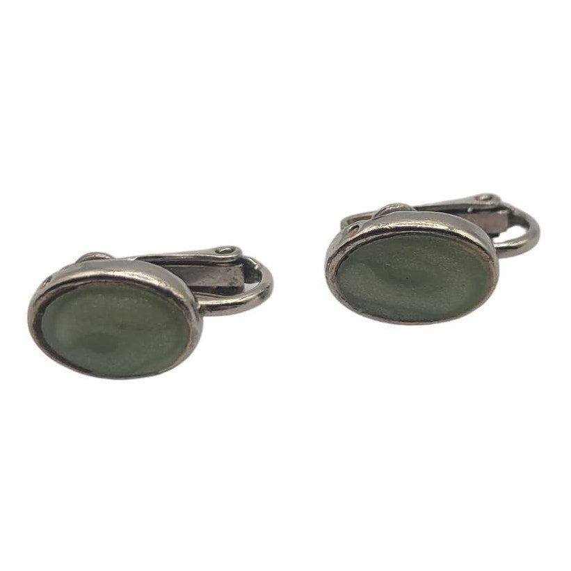Get your hands on these vintage 1970s clip-on earrings. The earrings feature a silver tone and an oval stone inset in a shade of sage green. The unique design of the earrings makes them stand out from any other piece of jewelry. Perfect for any occasion, these earrings are a must-have for any vintage jewelry collector. Don't miss the chance to add them to your collection today.