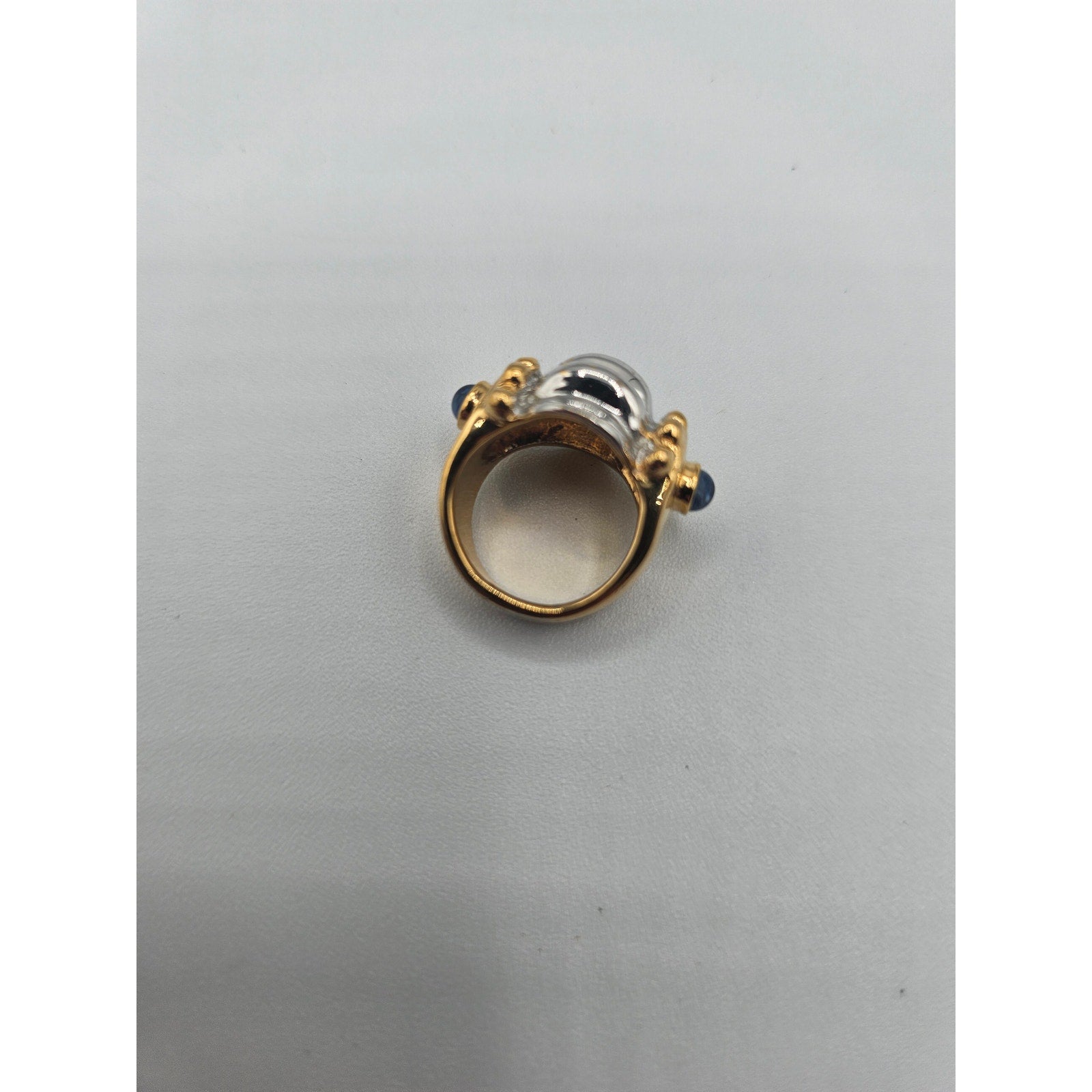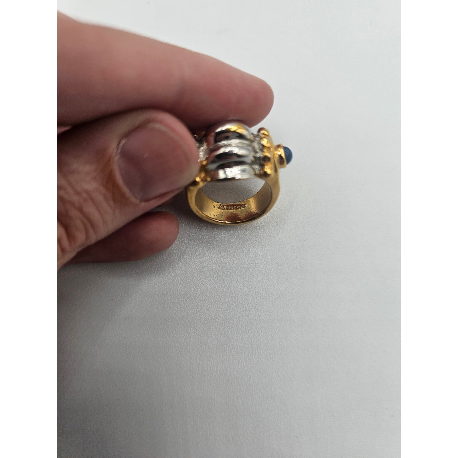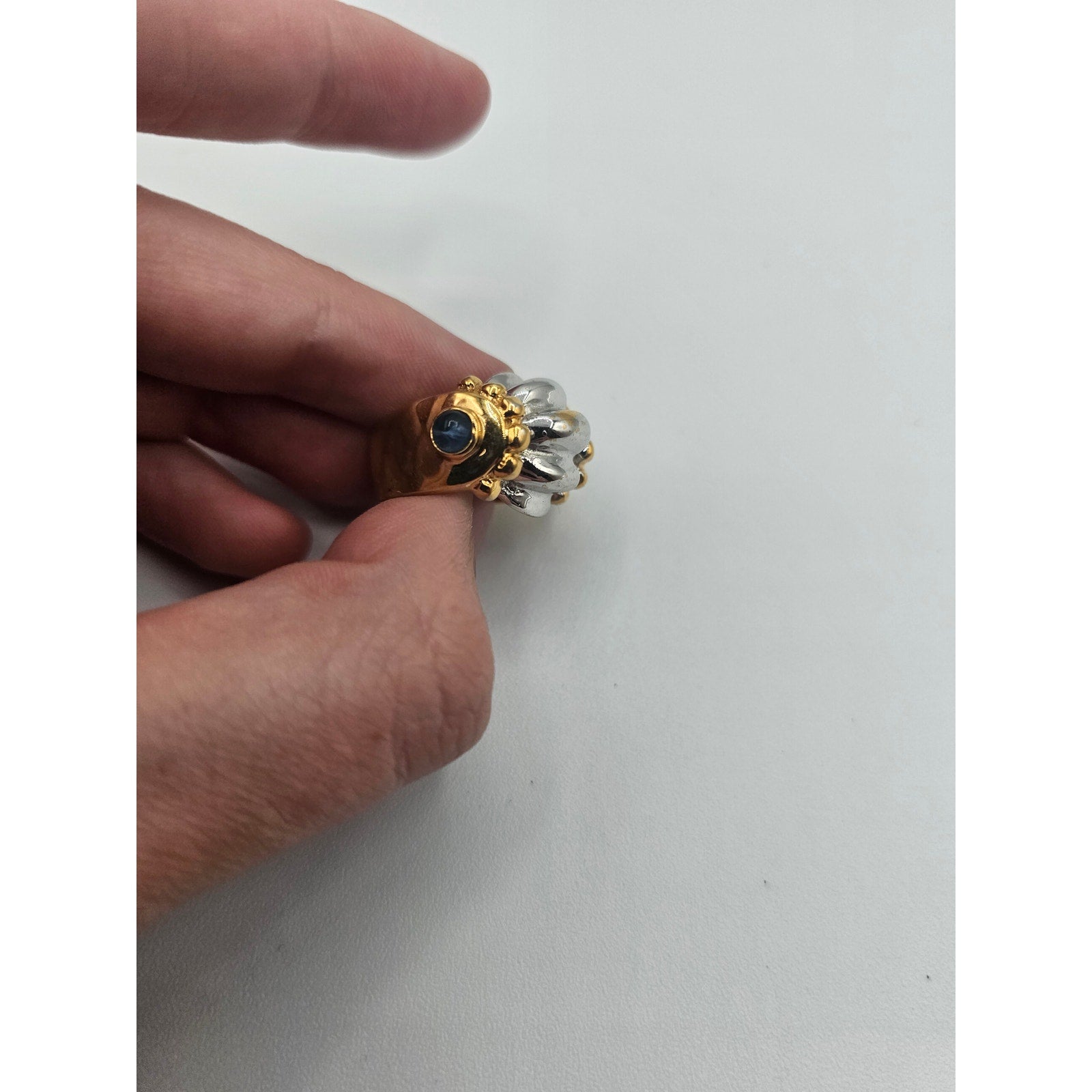 This vintage women's ring from the 1970s boasts a unique gold and silver tone design that is sure to catch the eye of any collector of costume jewelry. The ring is stamped with a mark of quality, ensuring its authenticity and value. It is a stunning addition to any collection of antique or vintage jewelry. The intricate design and attention to detail of this ring make it a true treasure for any fashion enthusiast. The gold and silver tones work beautifully together to create a timeless piece that will never go out of style. Don't miss out on the chance to add this stunning ring to your collection!