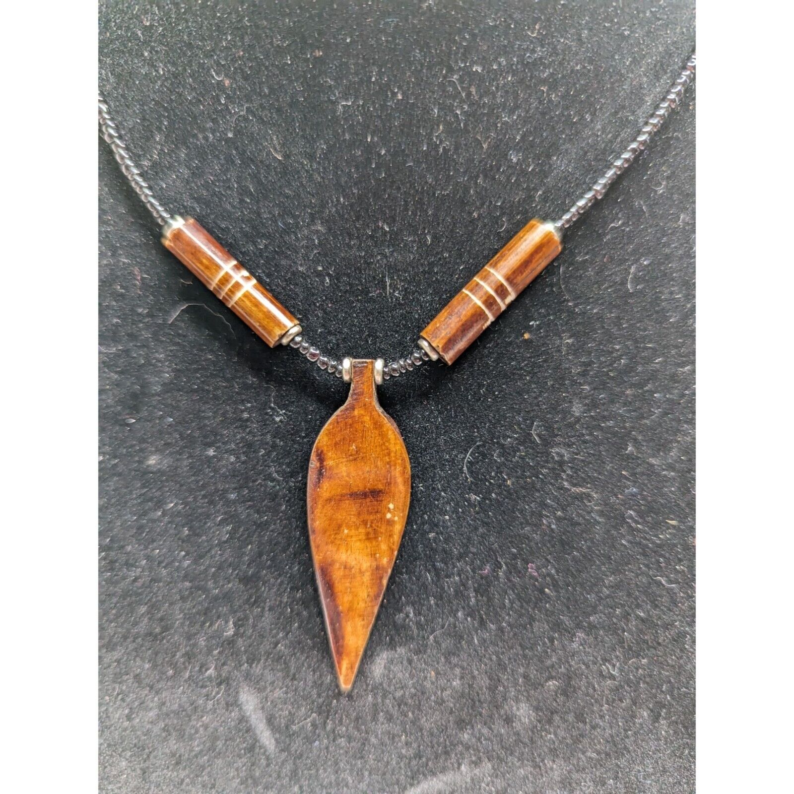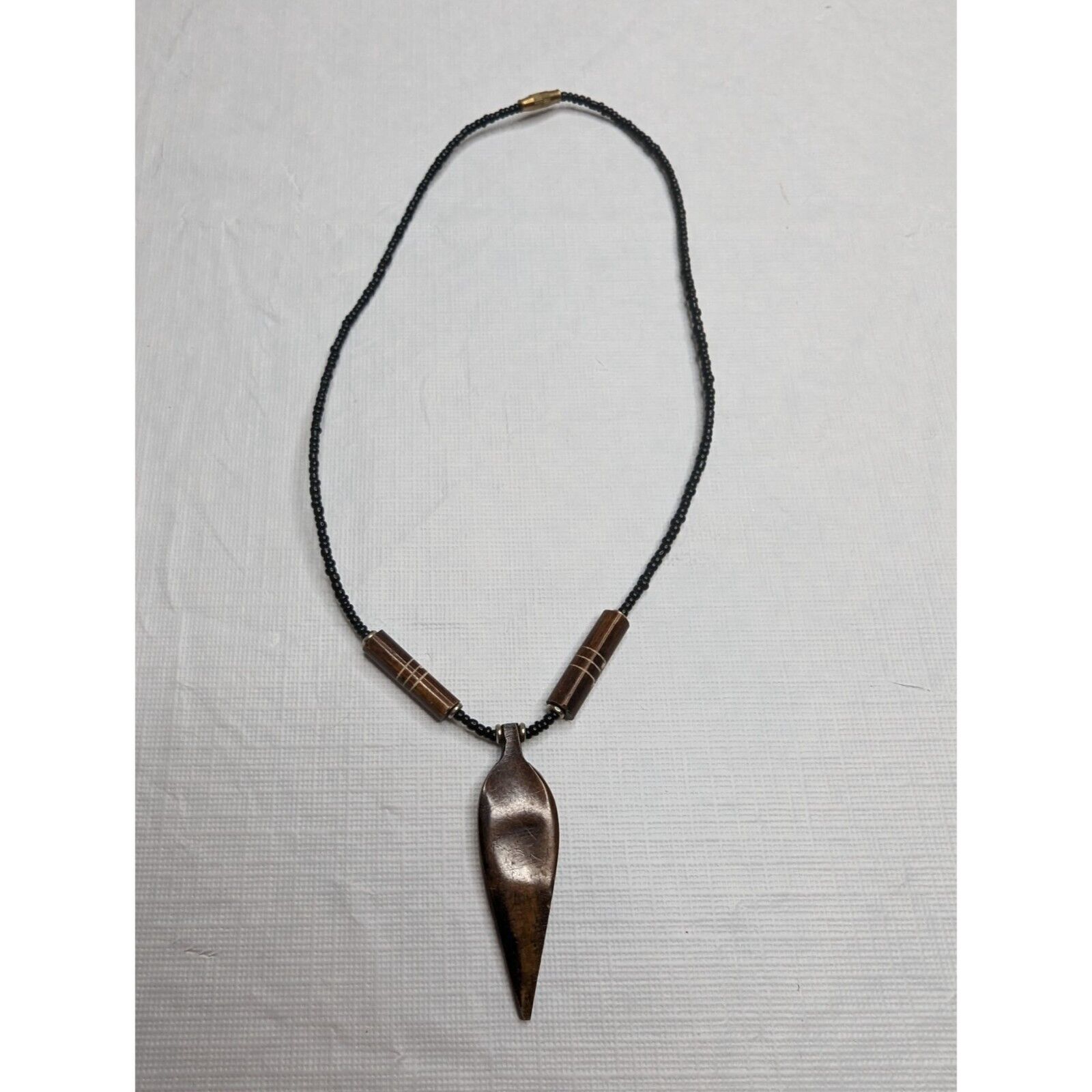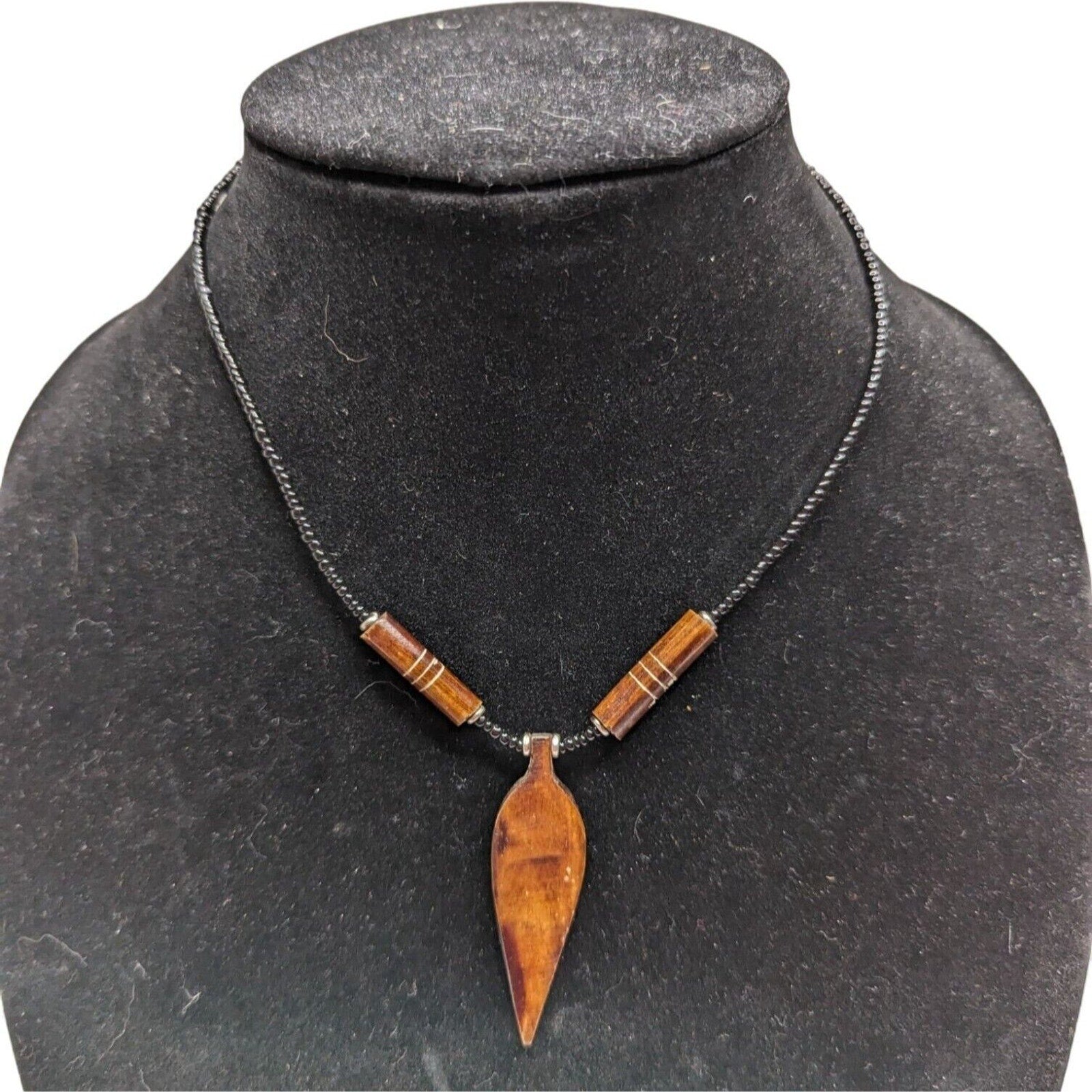 Vintage Beaded Statement Necklace Black Beads Wooden Pendant