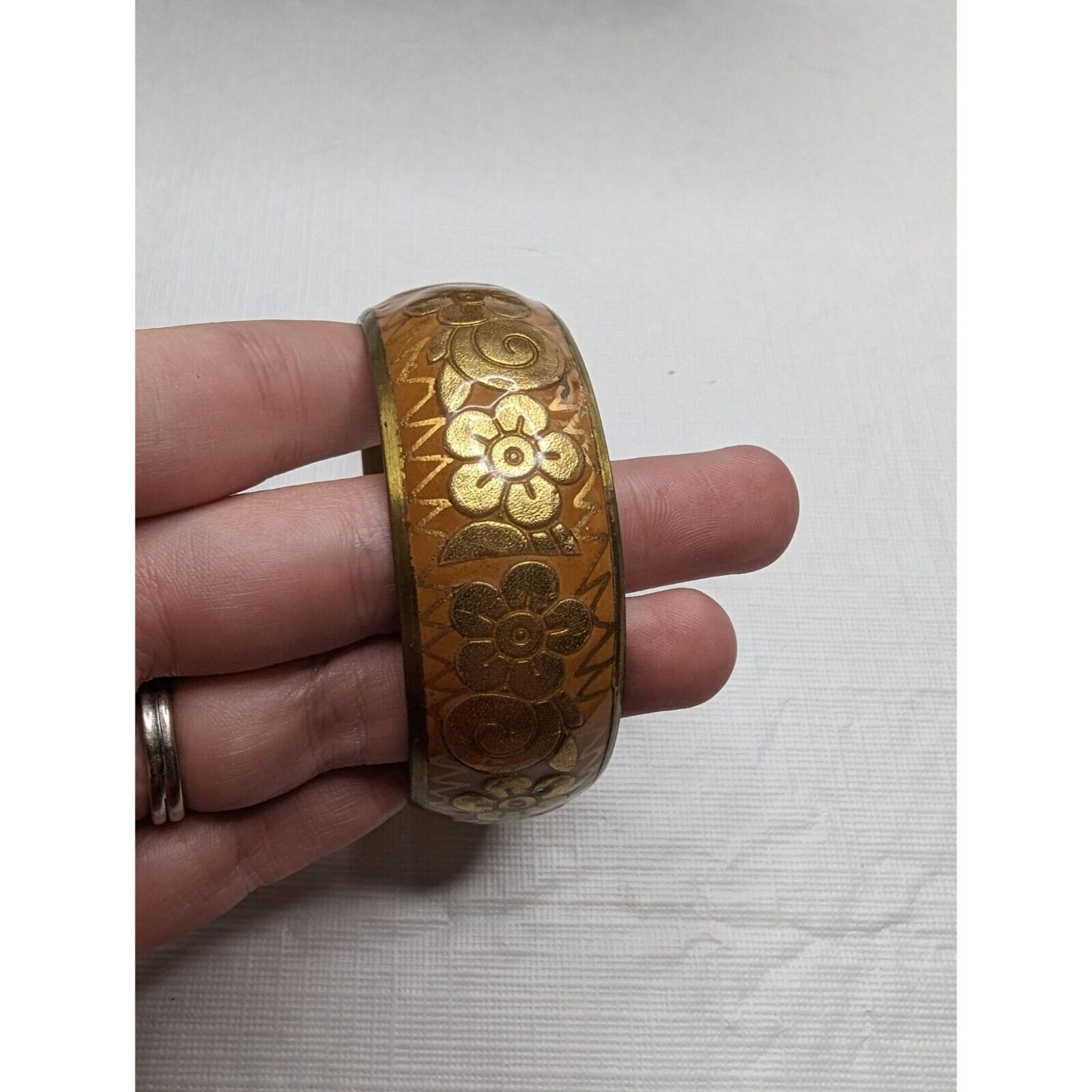 Vintage Brass and enamel Wide Bangle Bracelet Gold Tone Floral