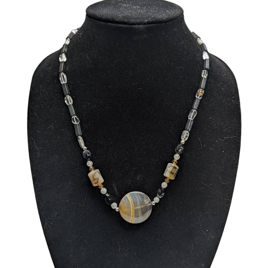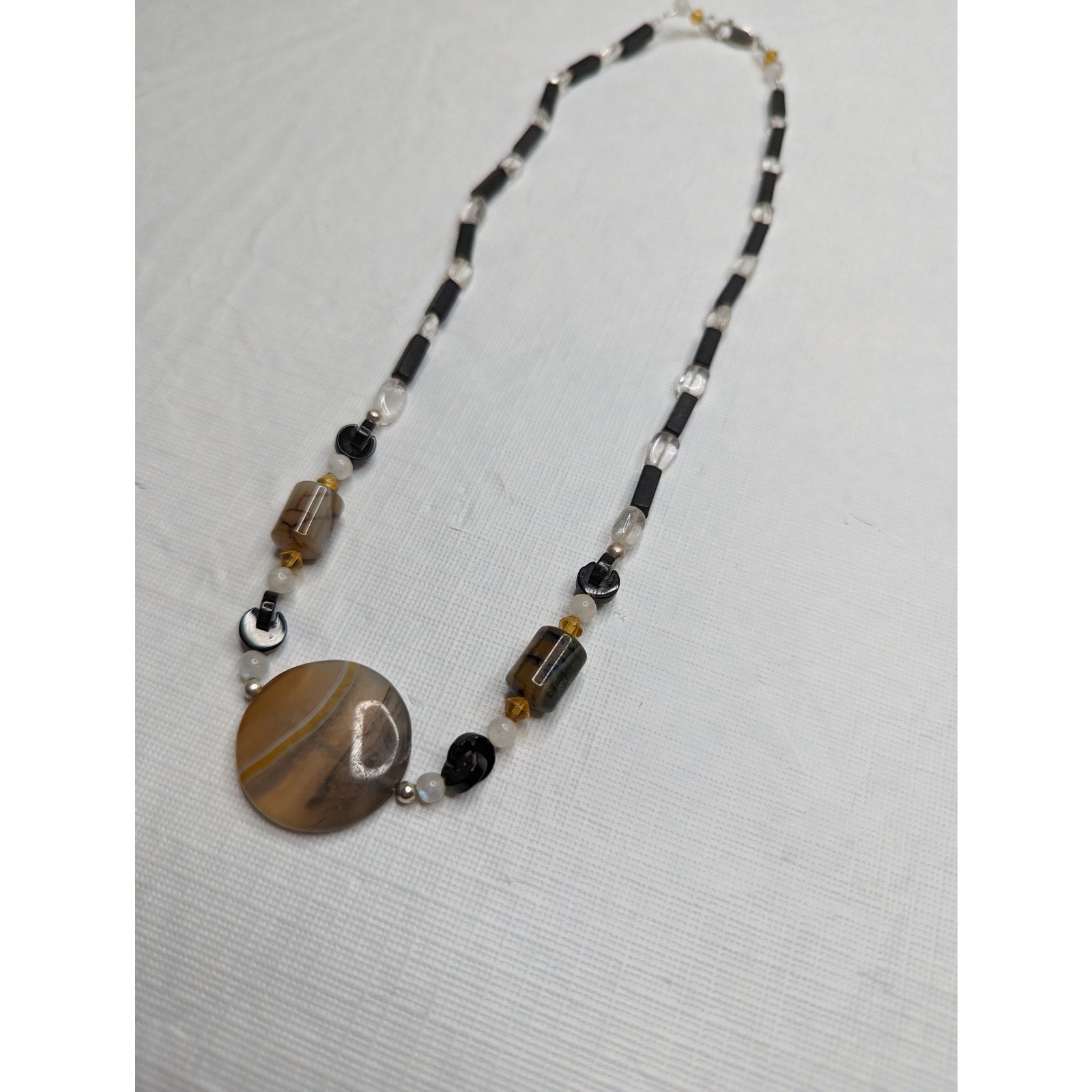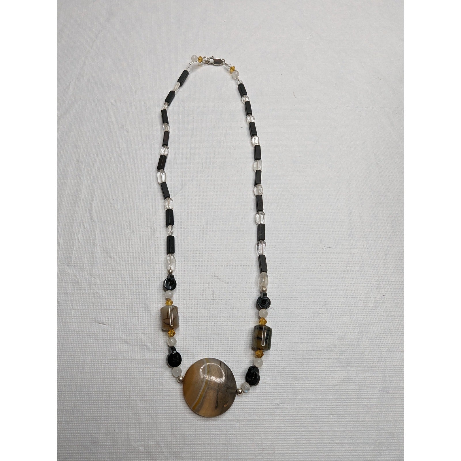 Vintage Glass Beaded Single Strand Necklace w/ Disk Stone Center Black White