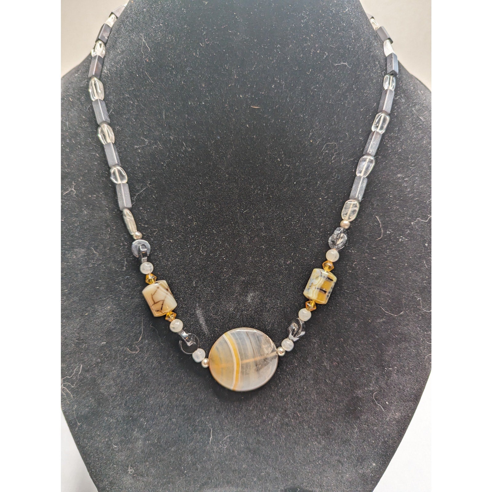 Add a touch of elegance to your outfit with this stunning vintage glass beaded single strand necklace. The focal point of this piece is the disk stone center in black and white, which perfectly complements the intricate beading. This necklace is a timeless treasure that will never go out of style. Whether you're dressing up for a special occasion or adding a touch of sophistication to your everyday look, this necklace is the perfect accessory. The intricate beading and unique disk stone center make this piece stand out, and it will quickly become a favorite in your collection. With its classic design and high-quality craftsmanship, this vintage necklace is a must-have for any jewelry lover.