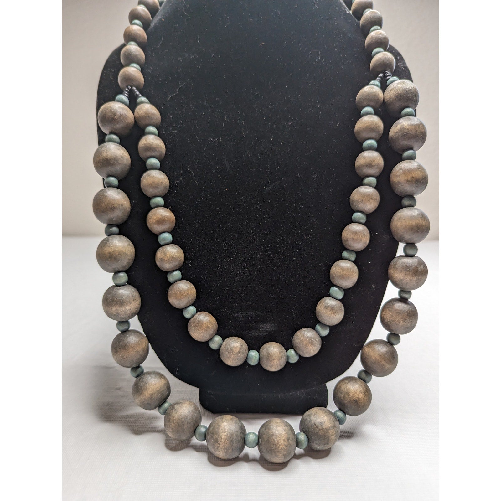Vintage Mid Century 2 Strand Wooden Round Bead Necklace Muted Blue Gray