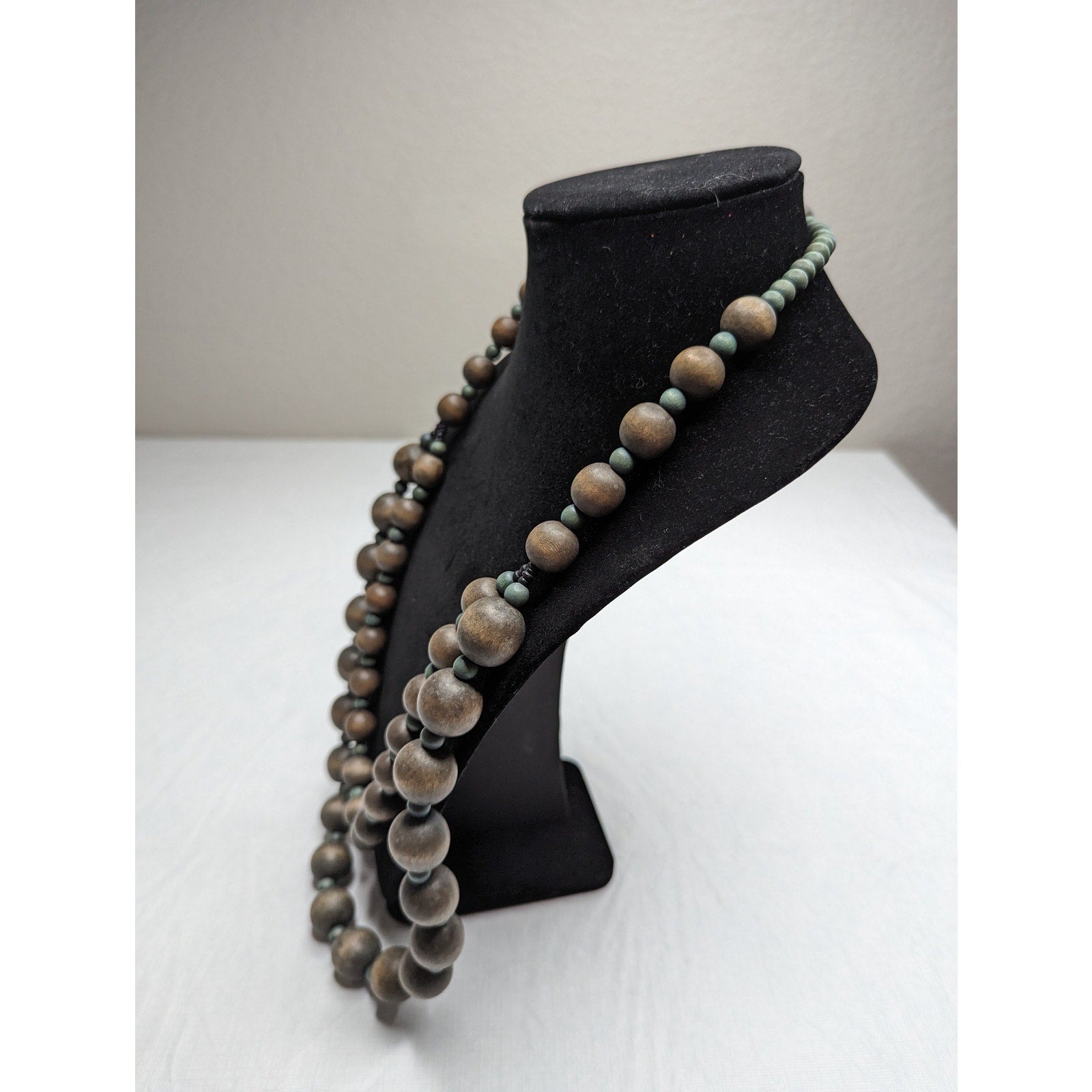 This vintage mid-century necklace features two strands of muted blue-gray wooden beads. The round beads are strung on a sturdy cord, creating a timeless look that can be dressed up or down. The necklace is in excellent condition and is a must-have for any collector of vintage jewelry. The beads have a beautiful natural texture and are sure to add a touch of vintage charm to any outfit.