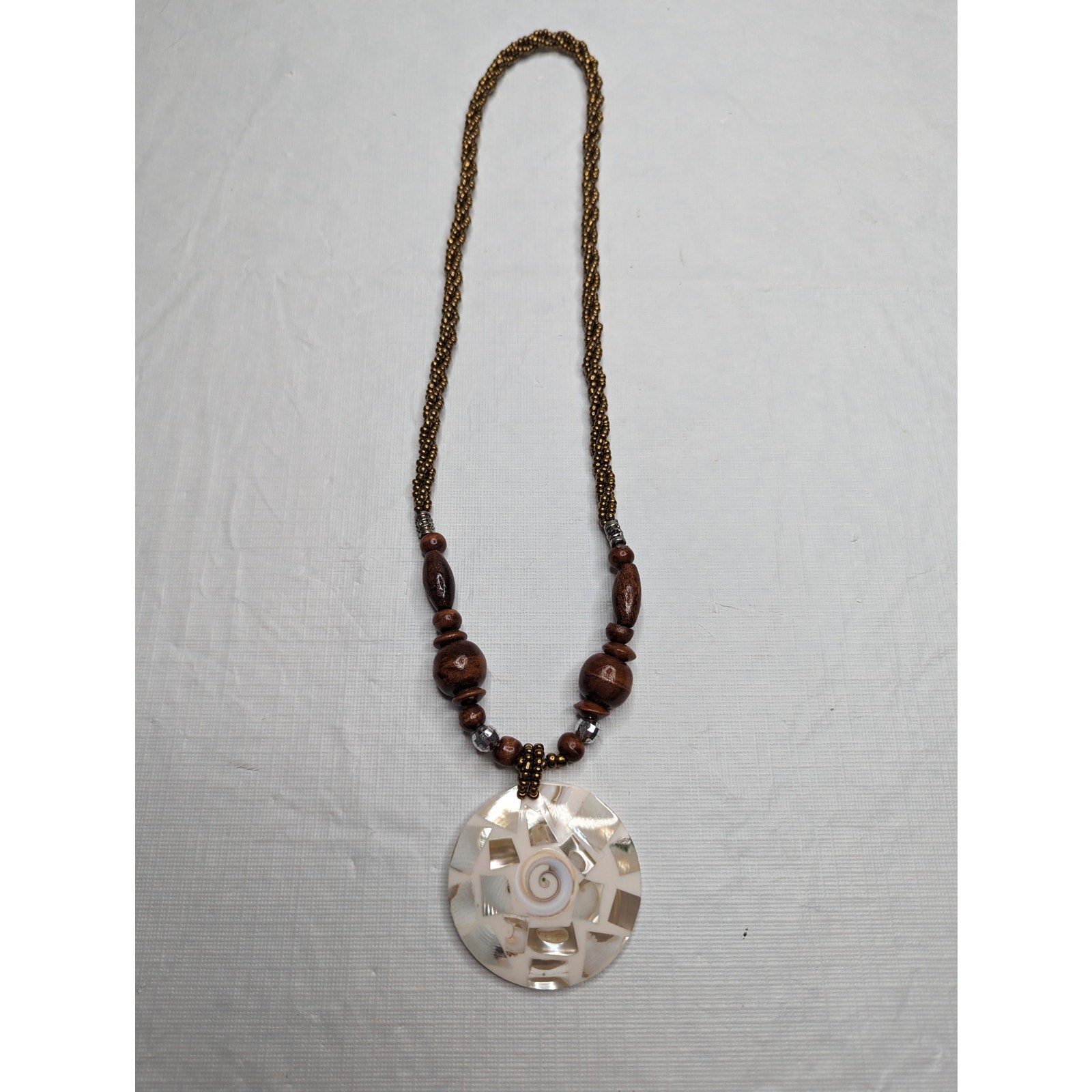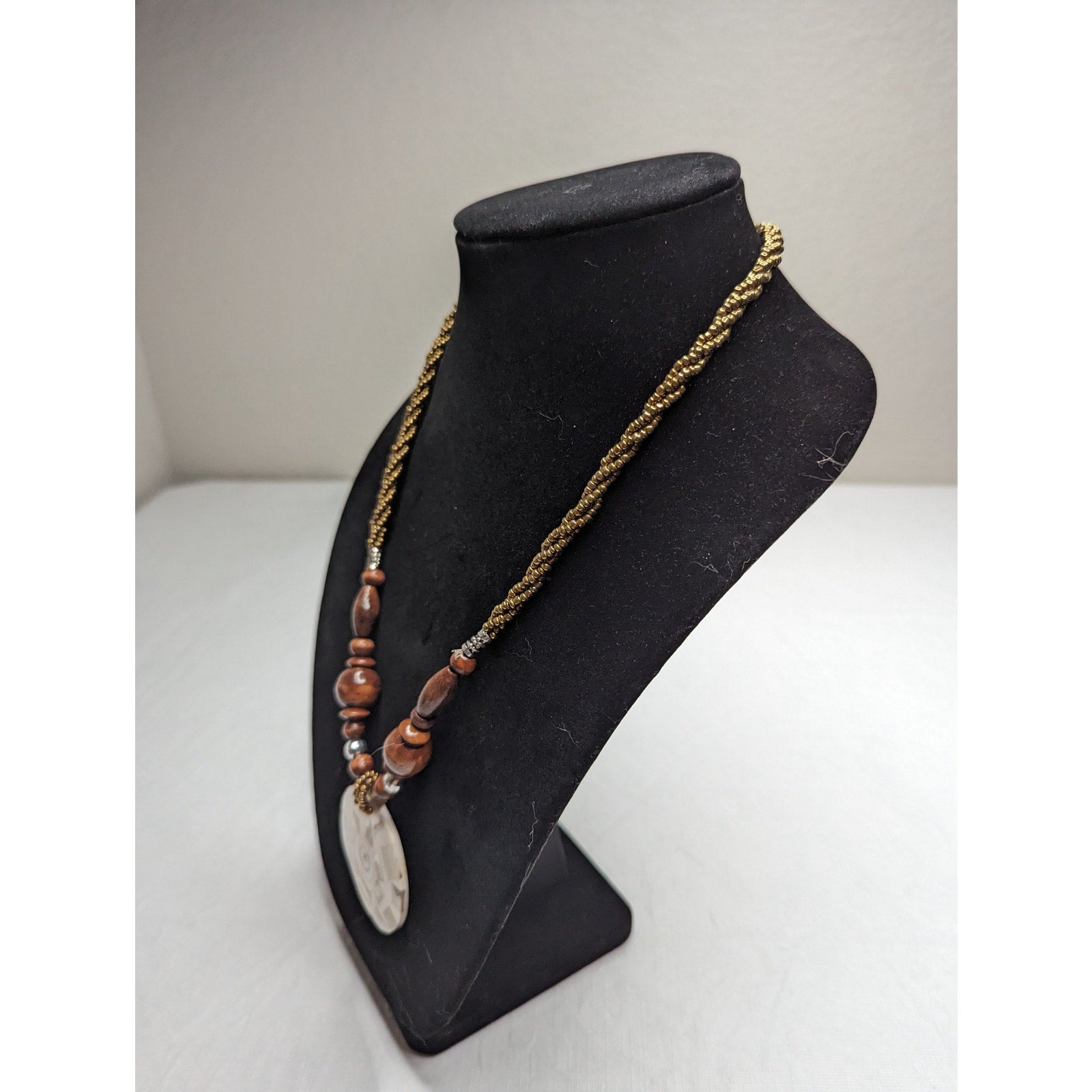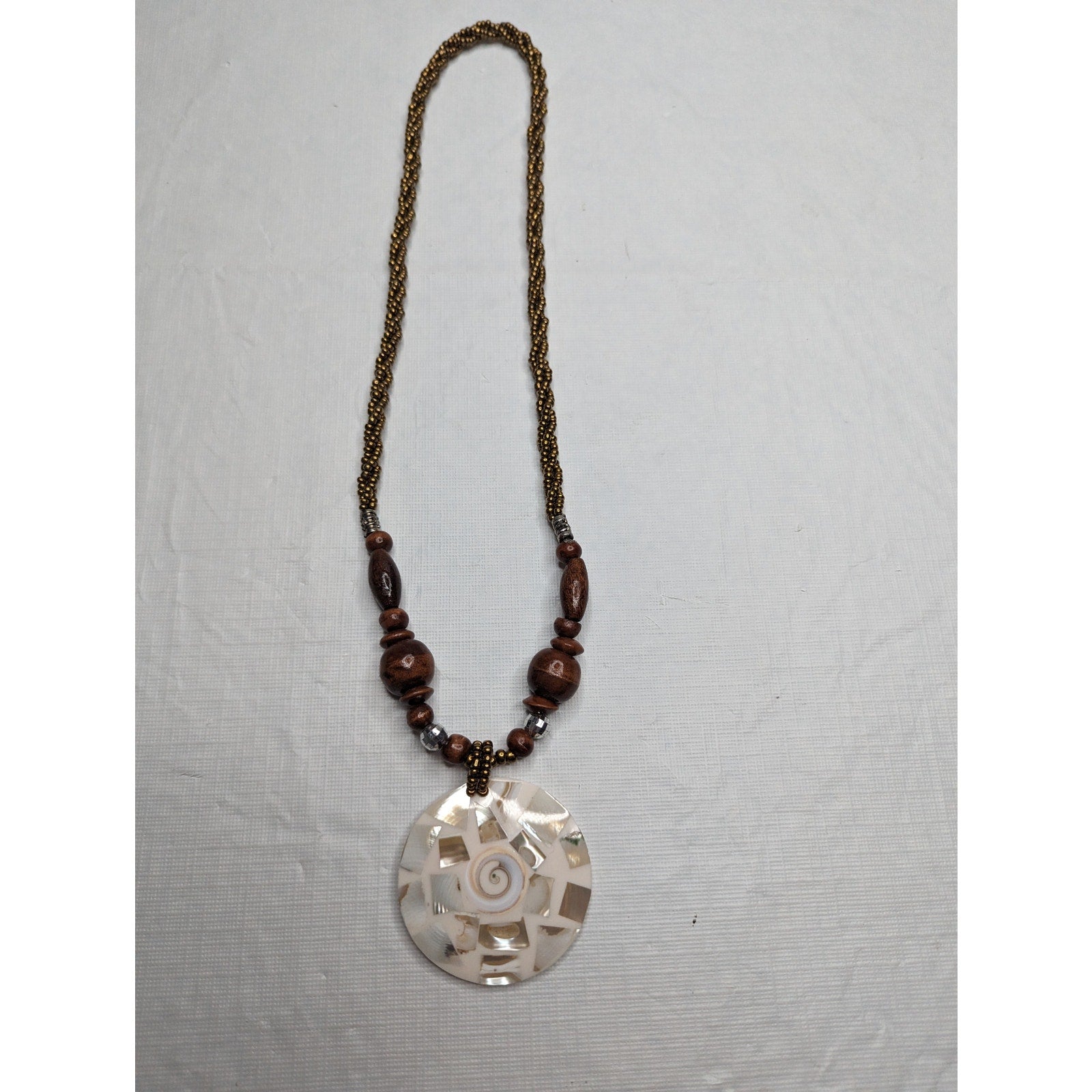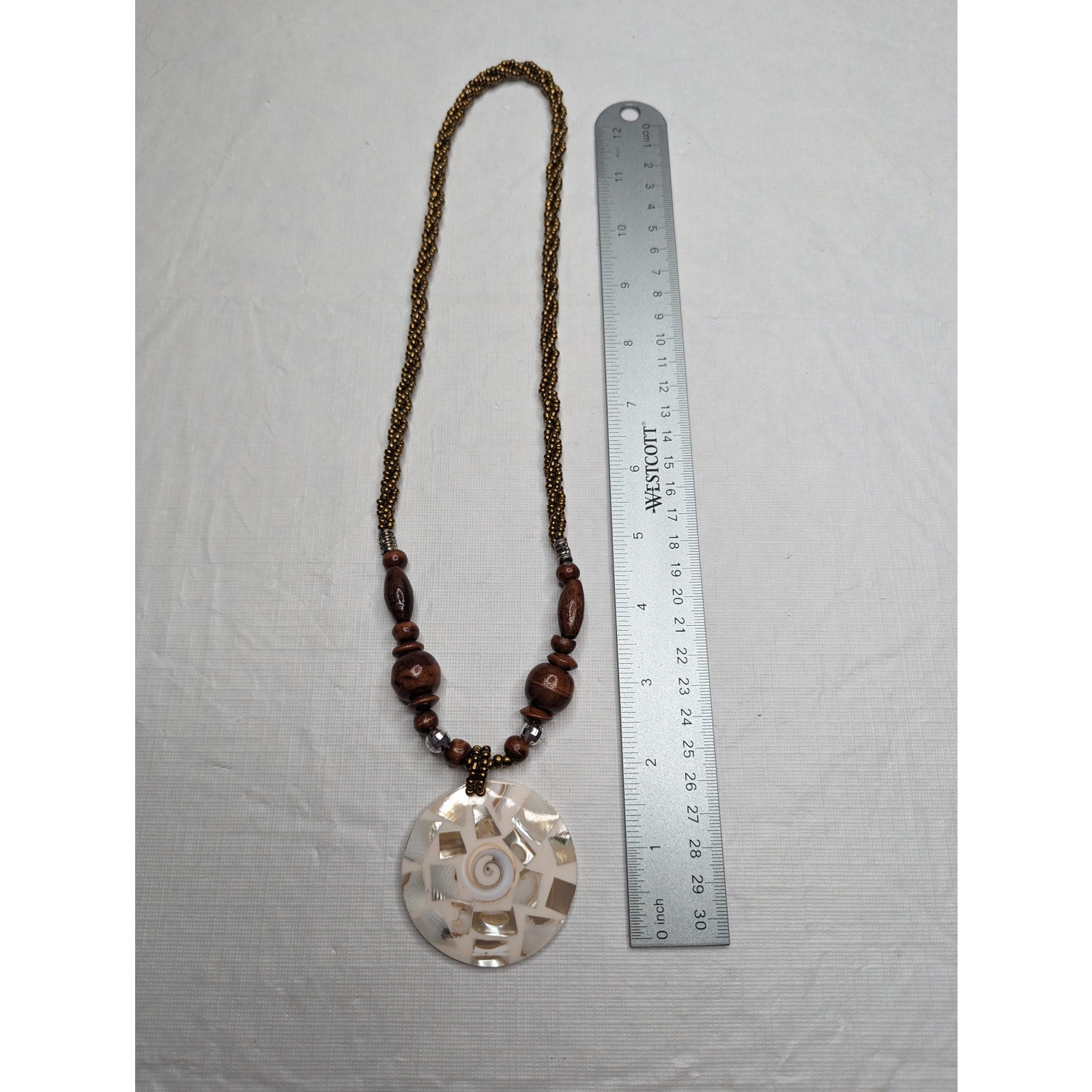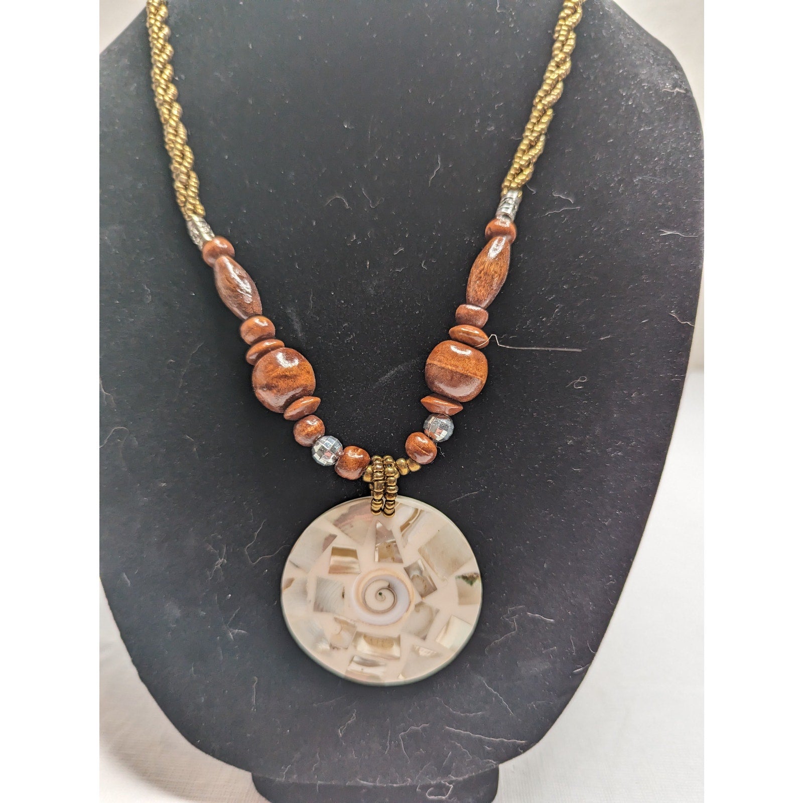 Vintage Mid Century Bold Pendant Statement Necklace Mother of Pearl Wooden Beads