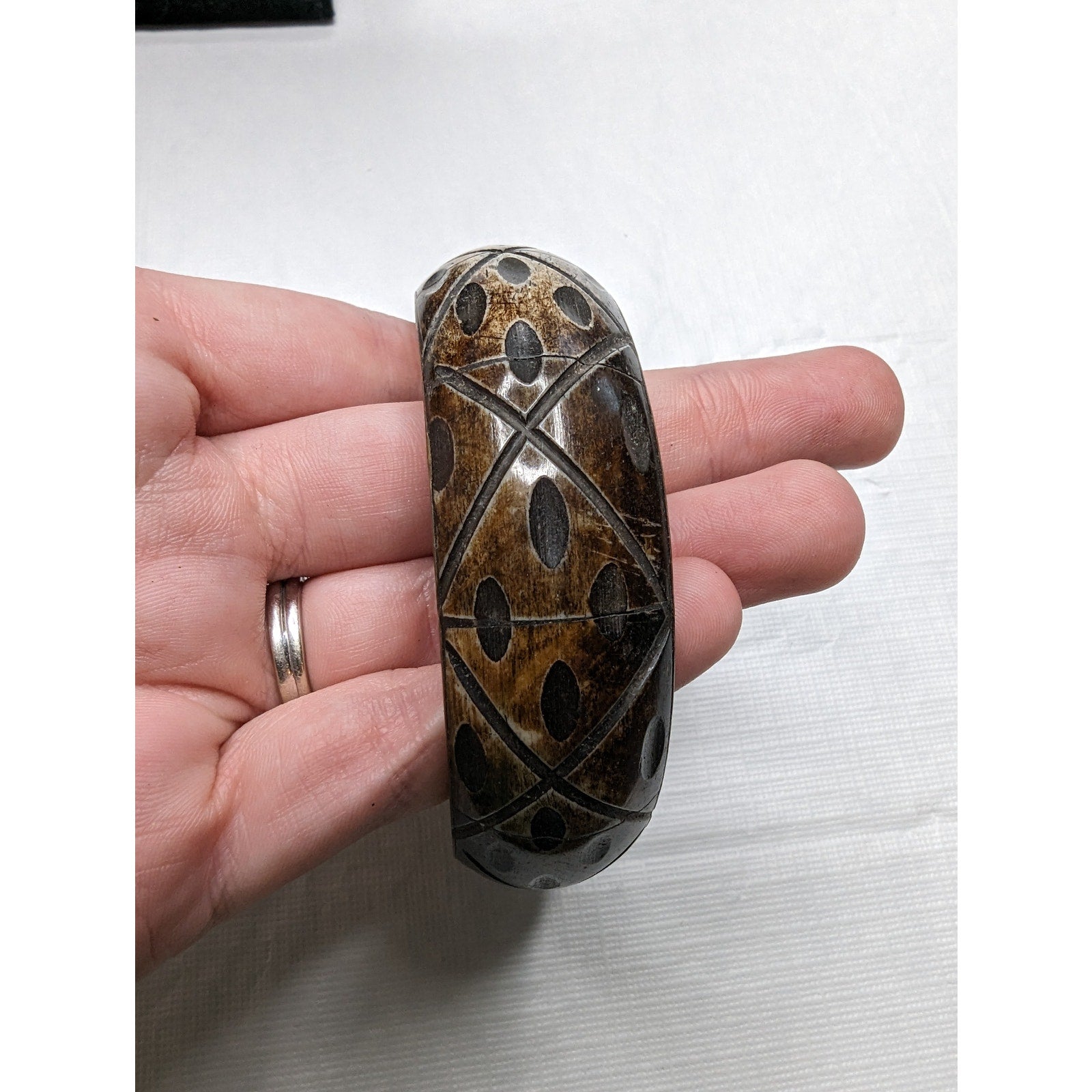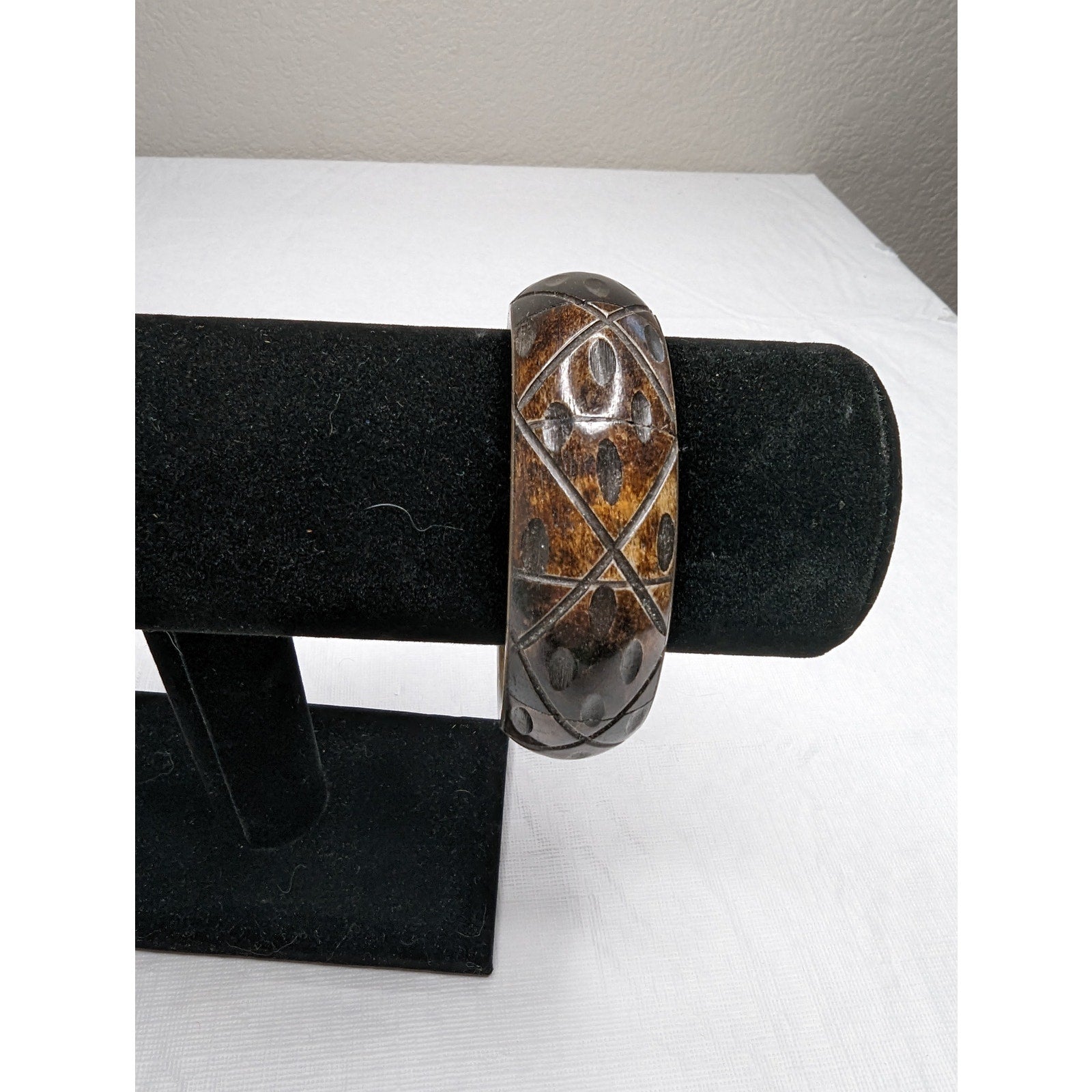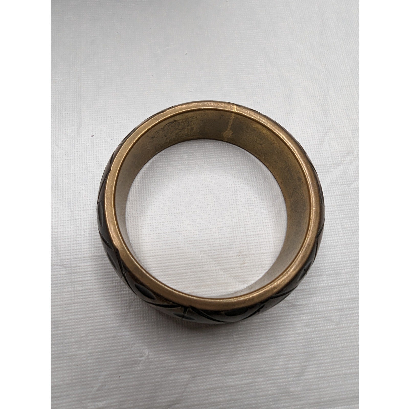 This vintage bangle bracelet boasts elegant brass and wood materials that give off a timeless and mid-century vibe. The hand-carved details add an extra touch of charm to this unique accessory. Perfect for pairing with any outfit for a vintage-inspired look.